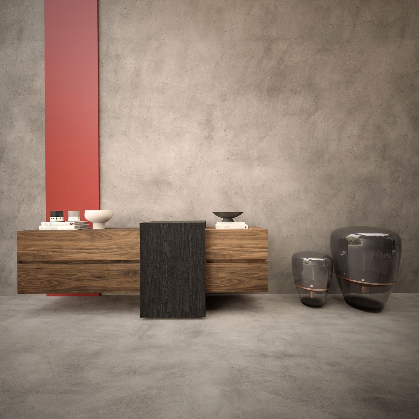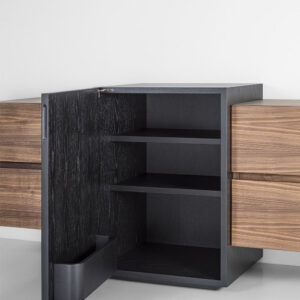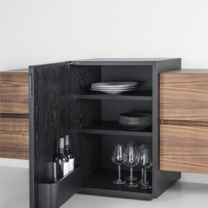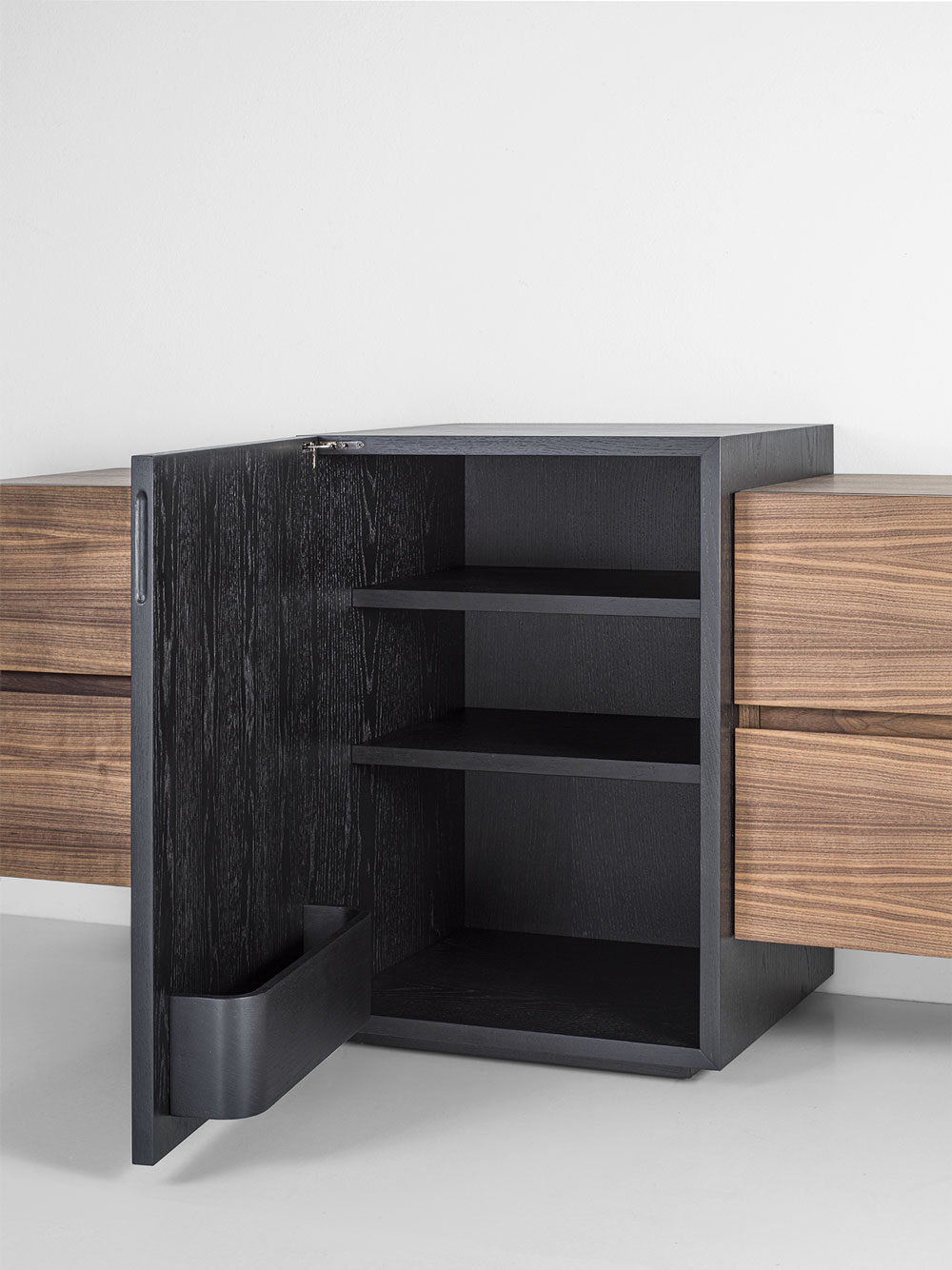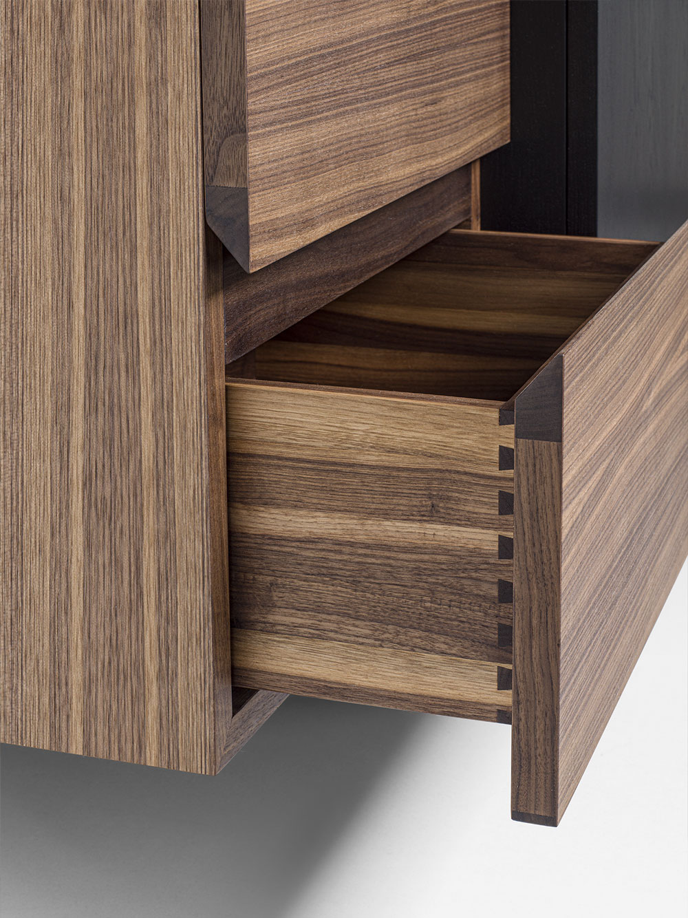 Sideboard aus Massivholz und Tischlerplatte, bestehend aus drei Modulen. Das zentrale Modul mit zwei Einlegeböden verfügt über eine Tür mit Flaschenhalter aus Massivholz und Soft-Close-System. Die seitlichen Module, die sich vom Boden abheben, bestehen aus Schubladen mit traditioneller Schwalbenschwanzverbindung und gefrästem Griff.