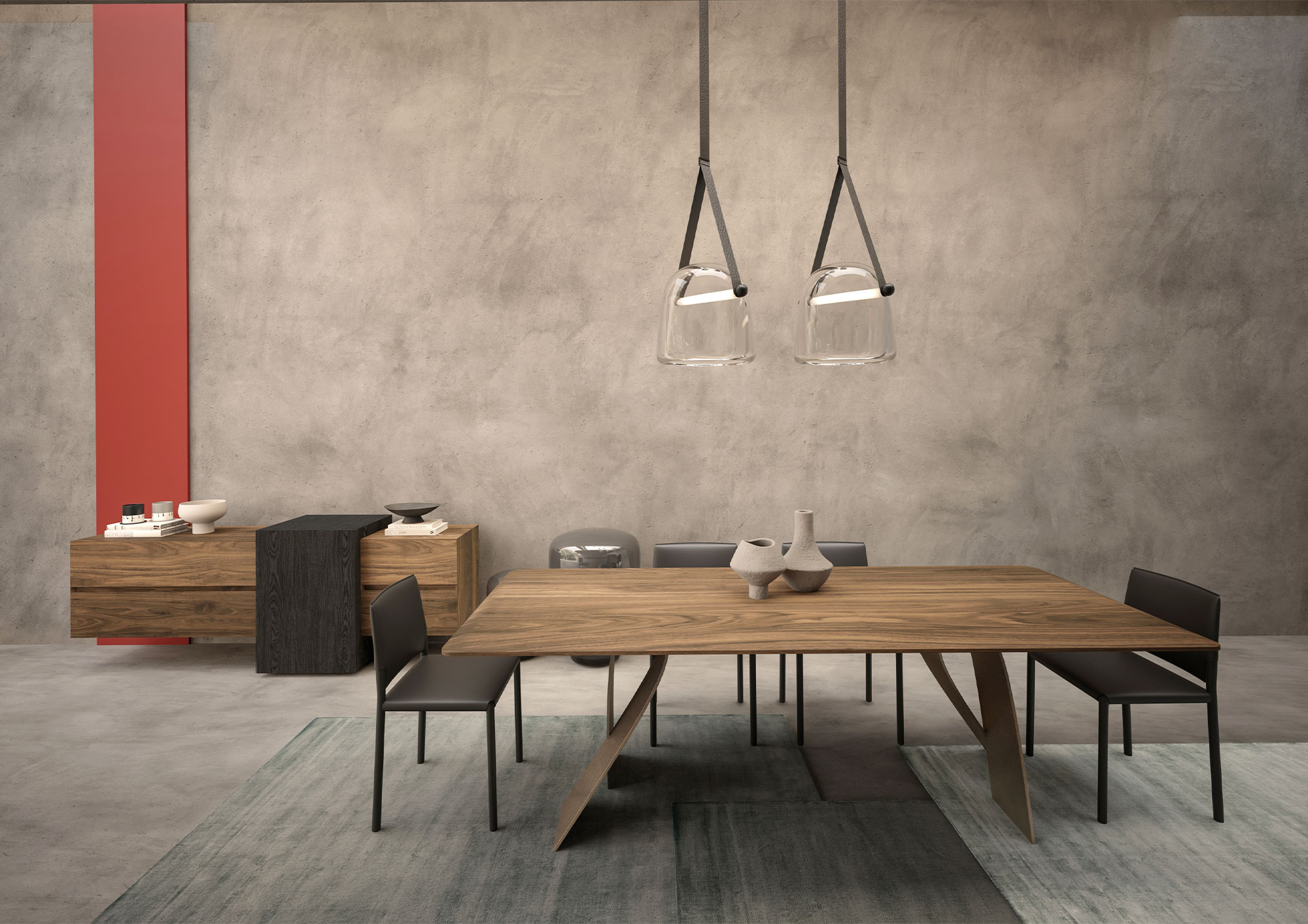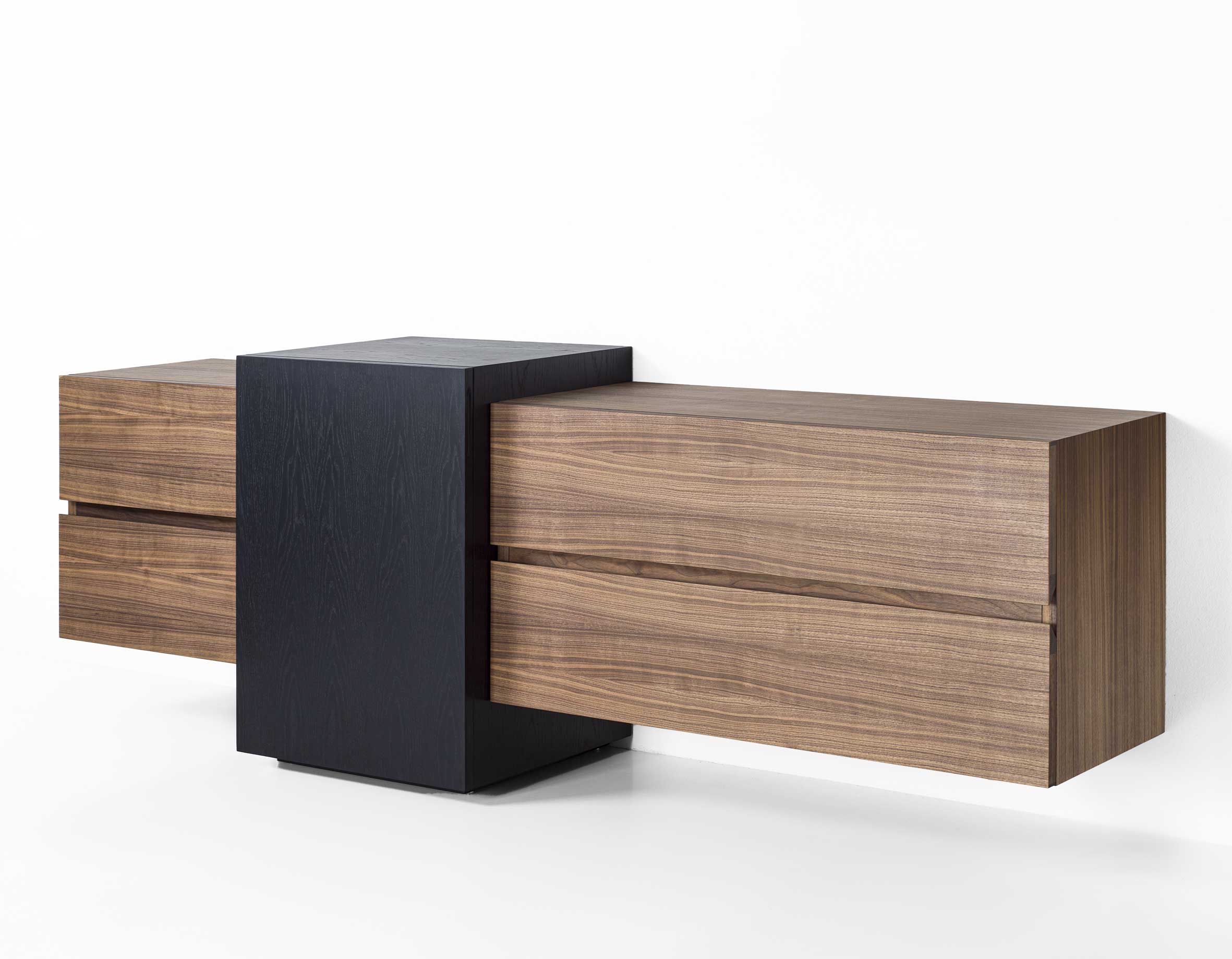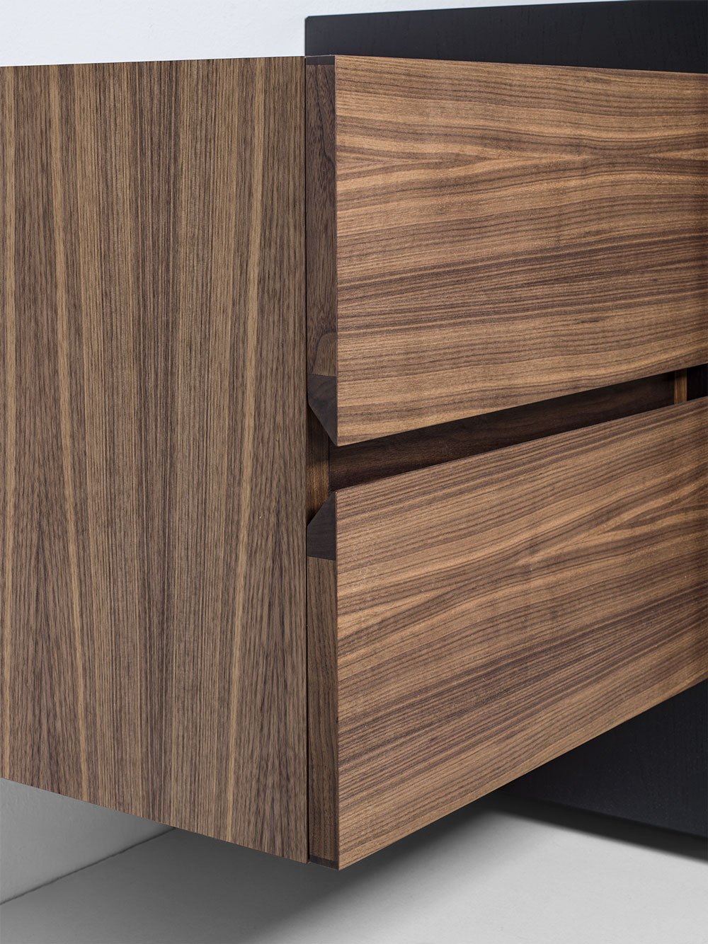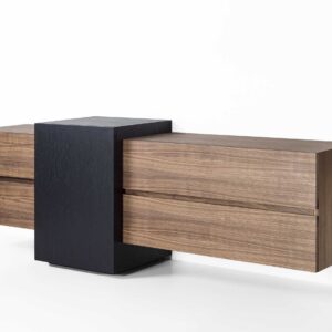 Sideboard aus Massivholz und Tischlerplatte, bestehend aus drei Modulen. Das zentrale Modul mit zwei Einlegeböden verfügt über eine Tür mit Flaschenhalter aus Massivholz und Soft-Close-System. Die seitlichen Module, die sich vom Boden abheben, bestehen aus Schubladen mit traditioneller Schwalbenschwanzverbindung und gefrästem Griff.