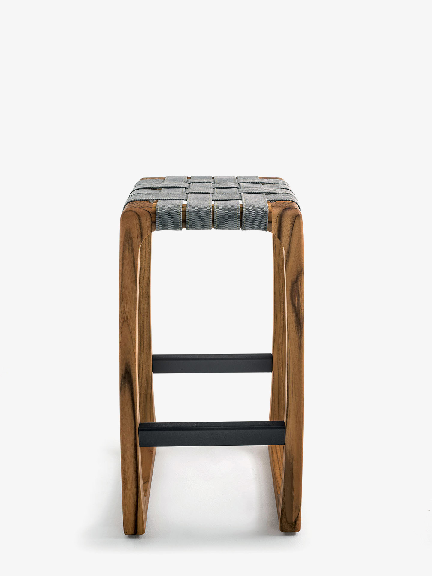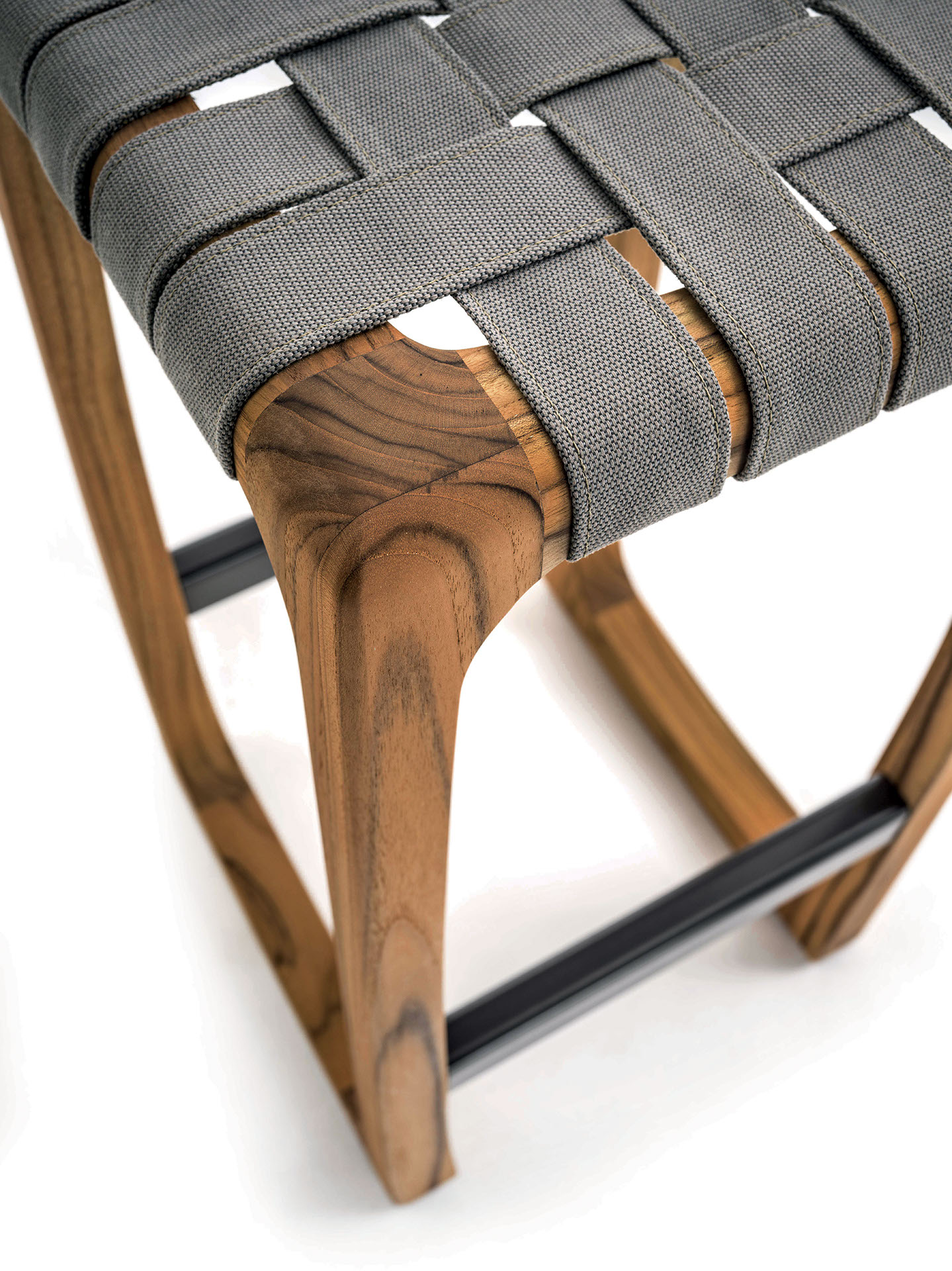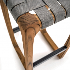 Barhocker mit Gestell aus Teakholz massiv, von Hand gedrechselt, aufgebaut und geschliffen, mit Fußstützen aus Eisen. Sitzfläche aus Streifen in Outdoor-Stoff.