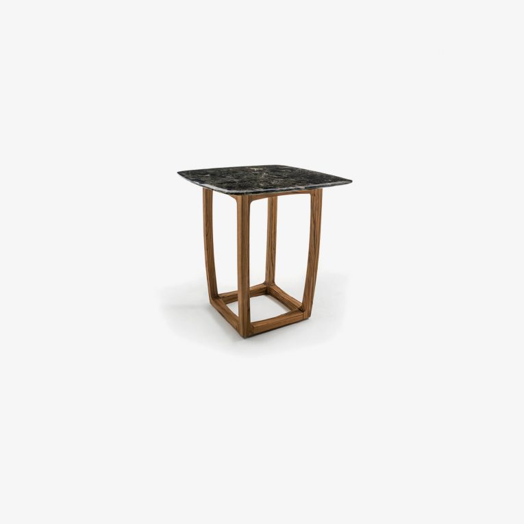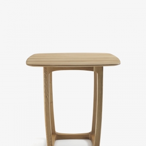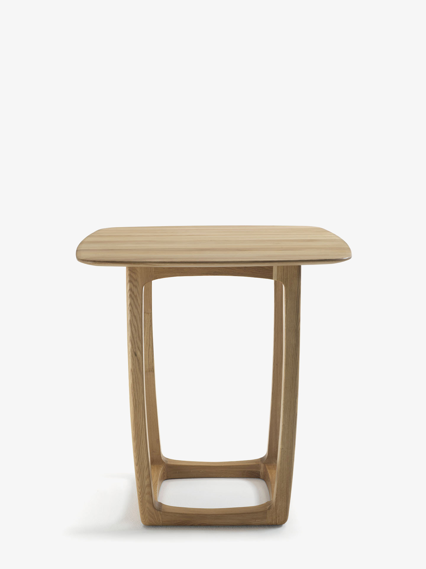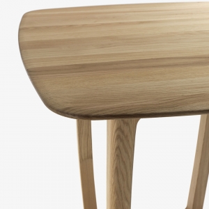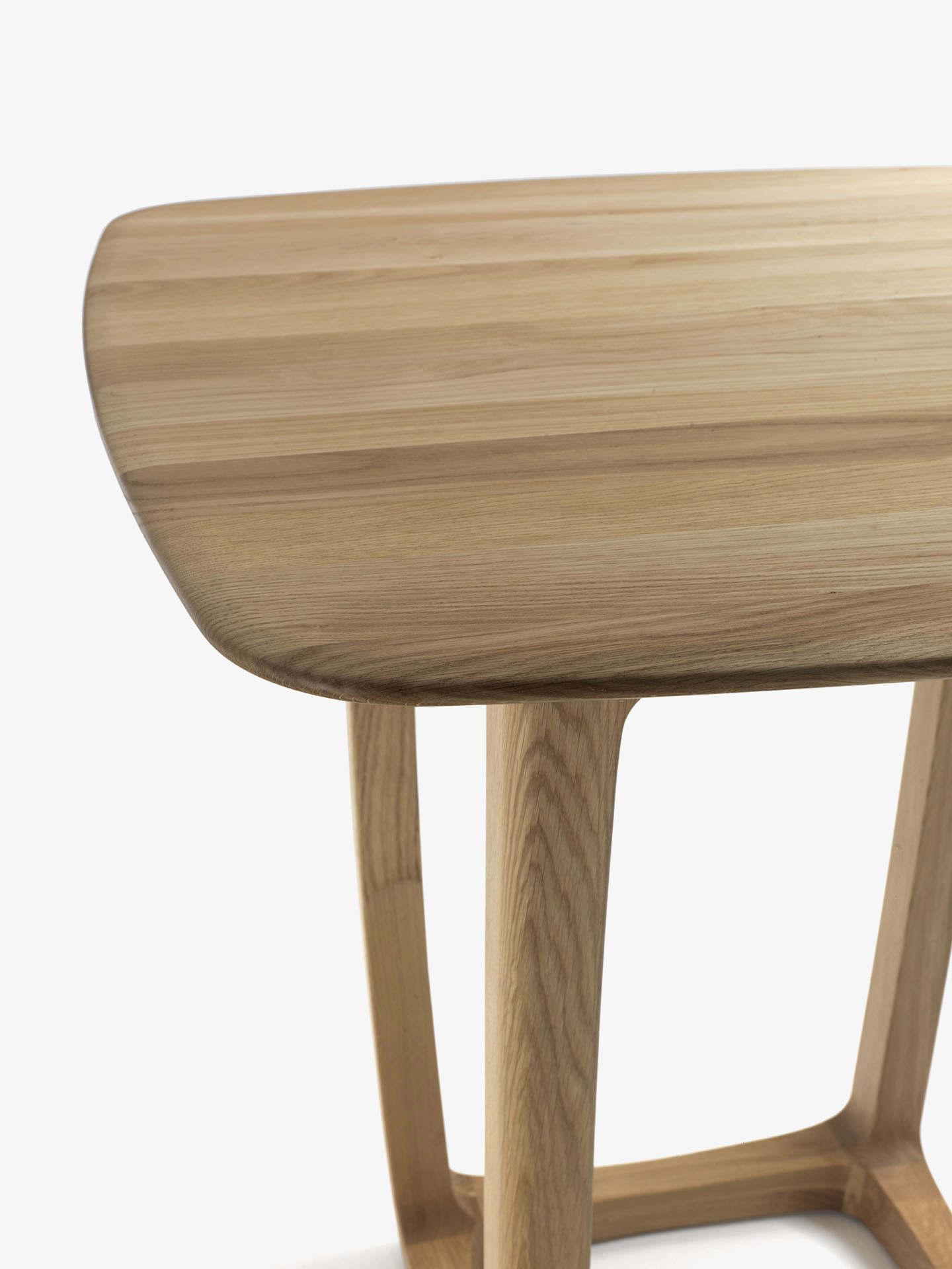 Stehtisch mit Untergestell aus Massivholz mit quadratischer Grundfläche, von Hand gedrechselt, gebaut und geschliffen. Tischplatte aus Holz mit hervorstehenden, abgerundeten Kanten.