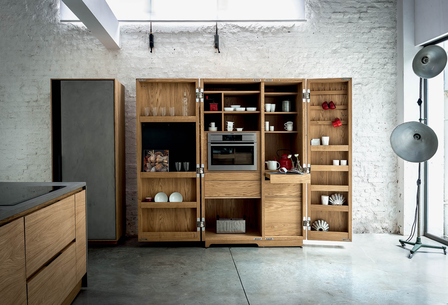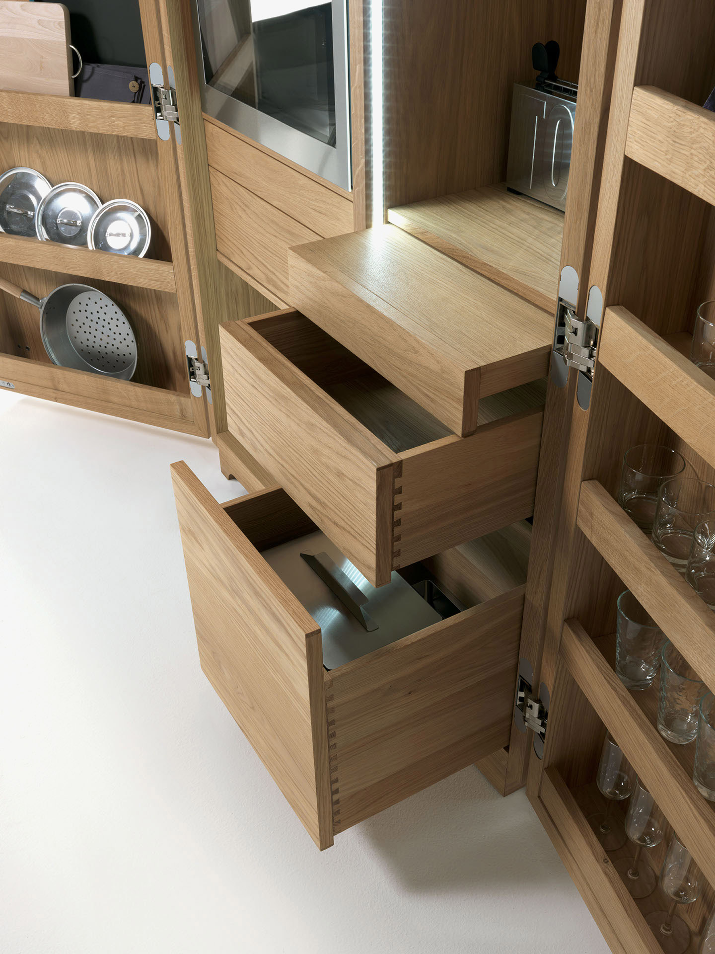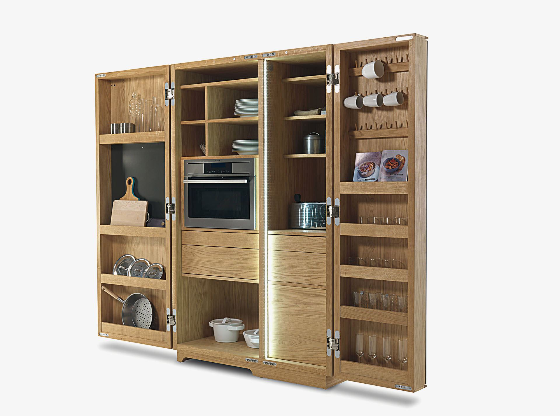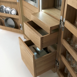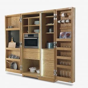 Mehrzweckschrank aus Massiv- und Furnierschichtholz, mit zwei um 180 Grag drehbaren Türen versehen. Innen ist der Schrank in Fächern verschiedener Größe unterteilt. Es besteht die Möglichkeit, in der Version Jumbo, kleine Geräte einzubauen. Die Regale an der Inneseite der Türen sind dafür gedacht, um Gläser; Geschirr und Sonstiges zu verstauen. In der Schrank-Mittelseitenwand sind Led-Lichtleisten montiert und dank eines Sensors geht das Licht beim Öffnen der Türen automatisch an.