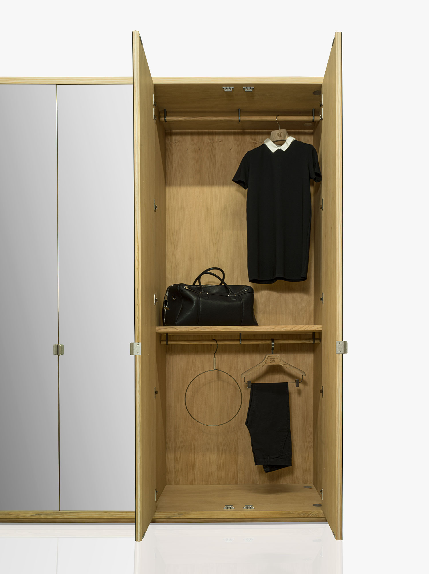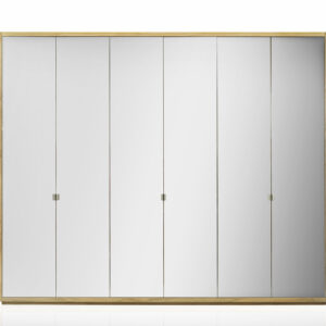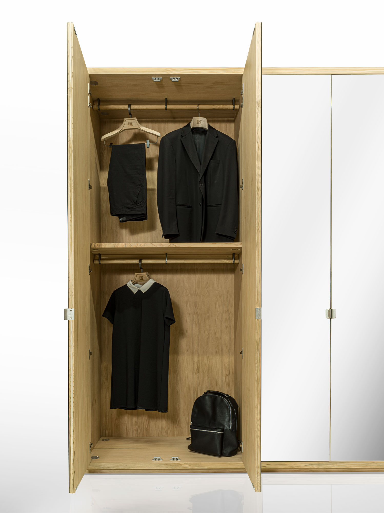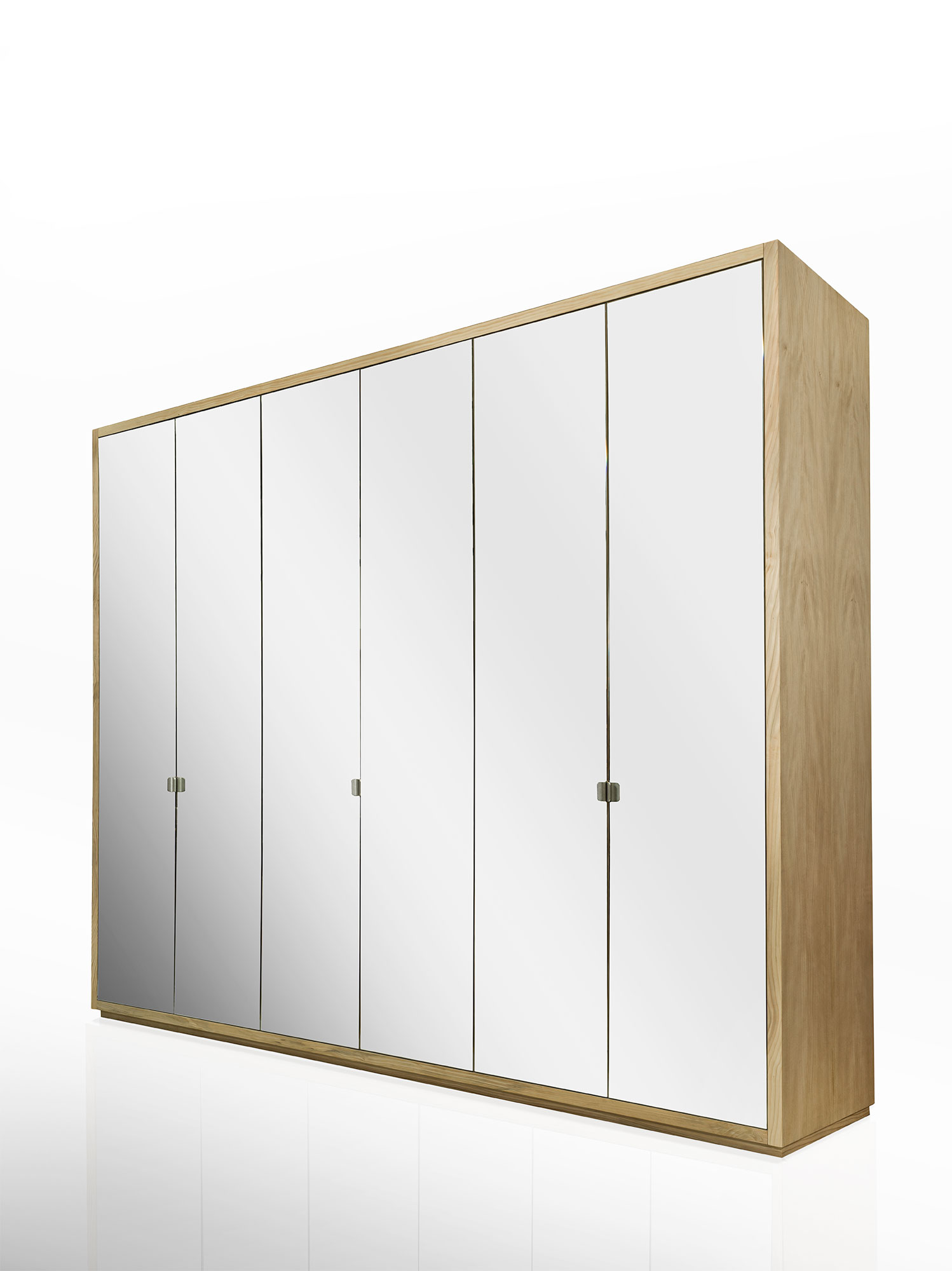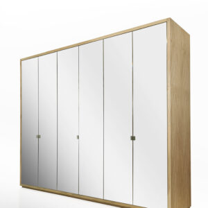 Kleiderschrank aus Massivholz und Tischlerplatte, Spiegeltüren mit Massivholzrahmen, Innenausstattung aus duftendem Zedernholz, ideal gegen Kleidermotten. Funktionelle Innenausstattung, je nach Wunsch erhältlich, mit Kleiderstangen, Einlegeböden, Schubladen mit traditioneller Schwalbenschwanzverbindung usw., die eine funktionale und modulare Organisation der verschiedenen Elemente je nach Bedarf und gewünschten Abmessungen ermöglicht.