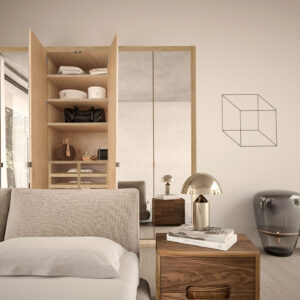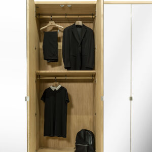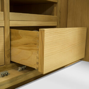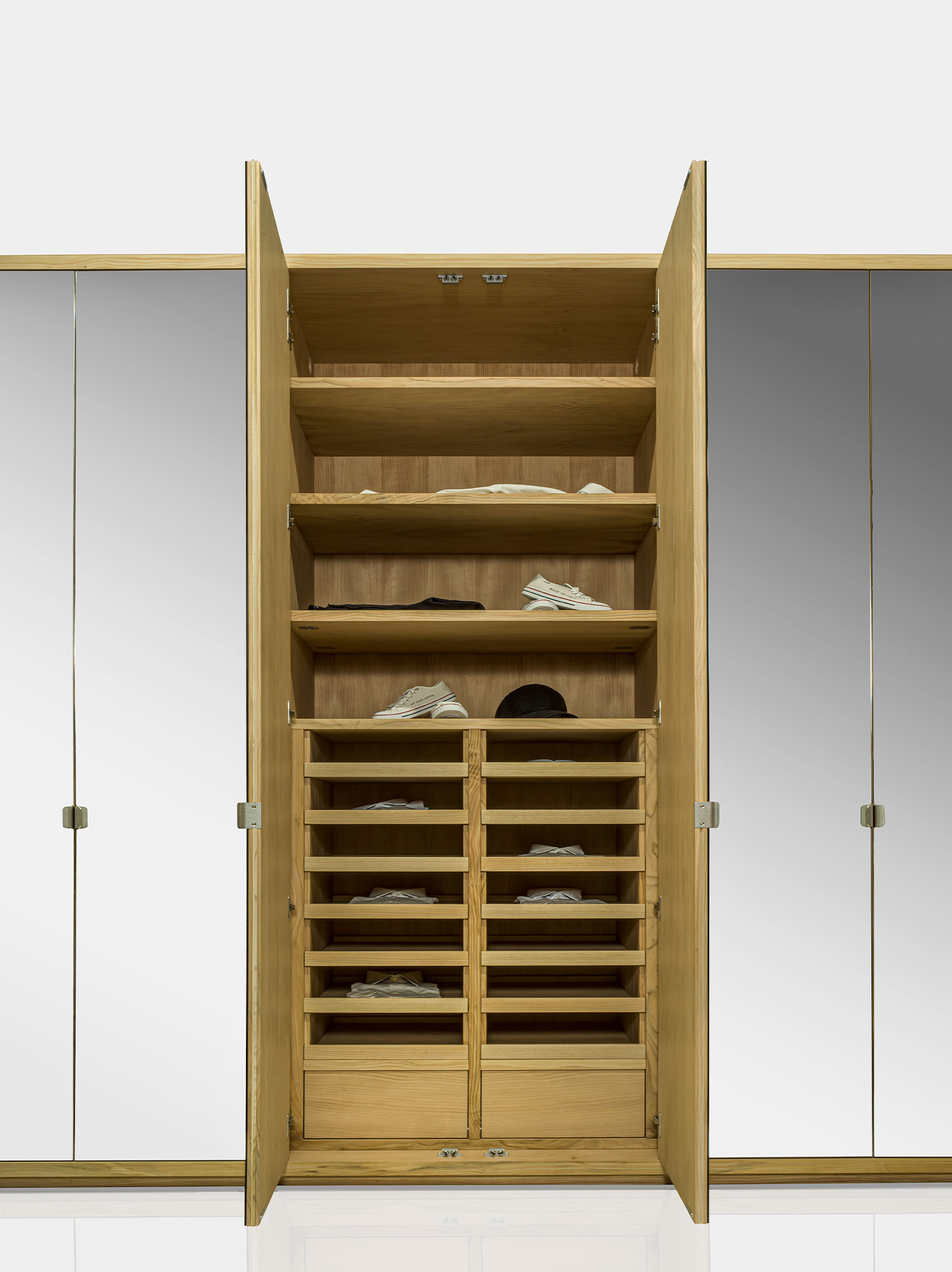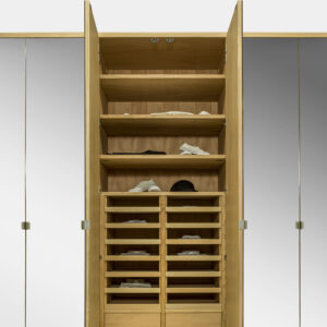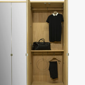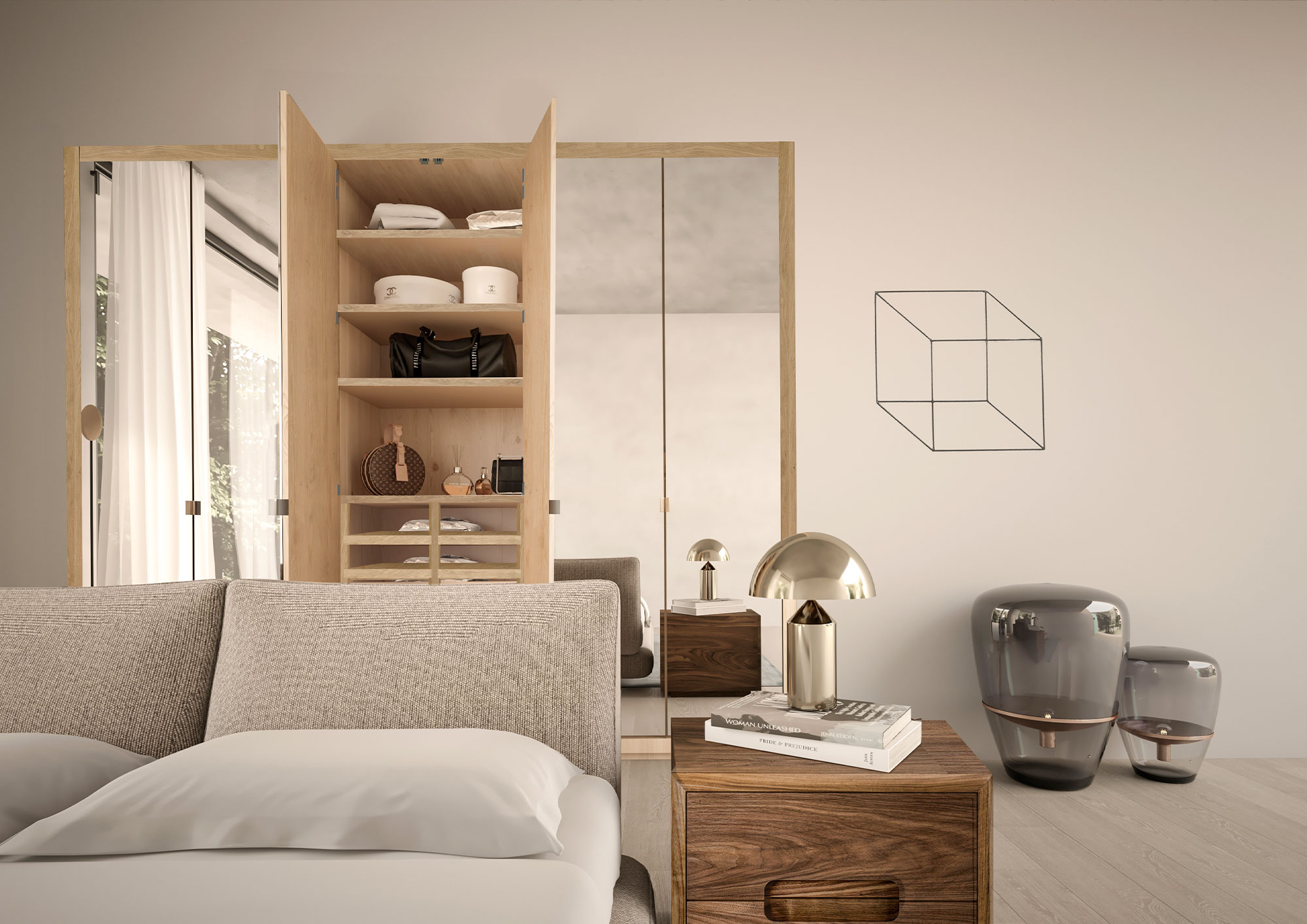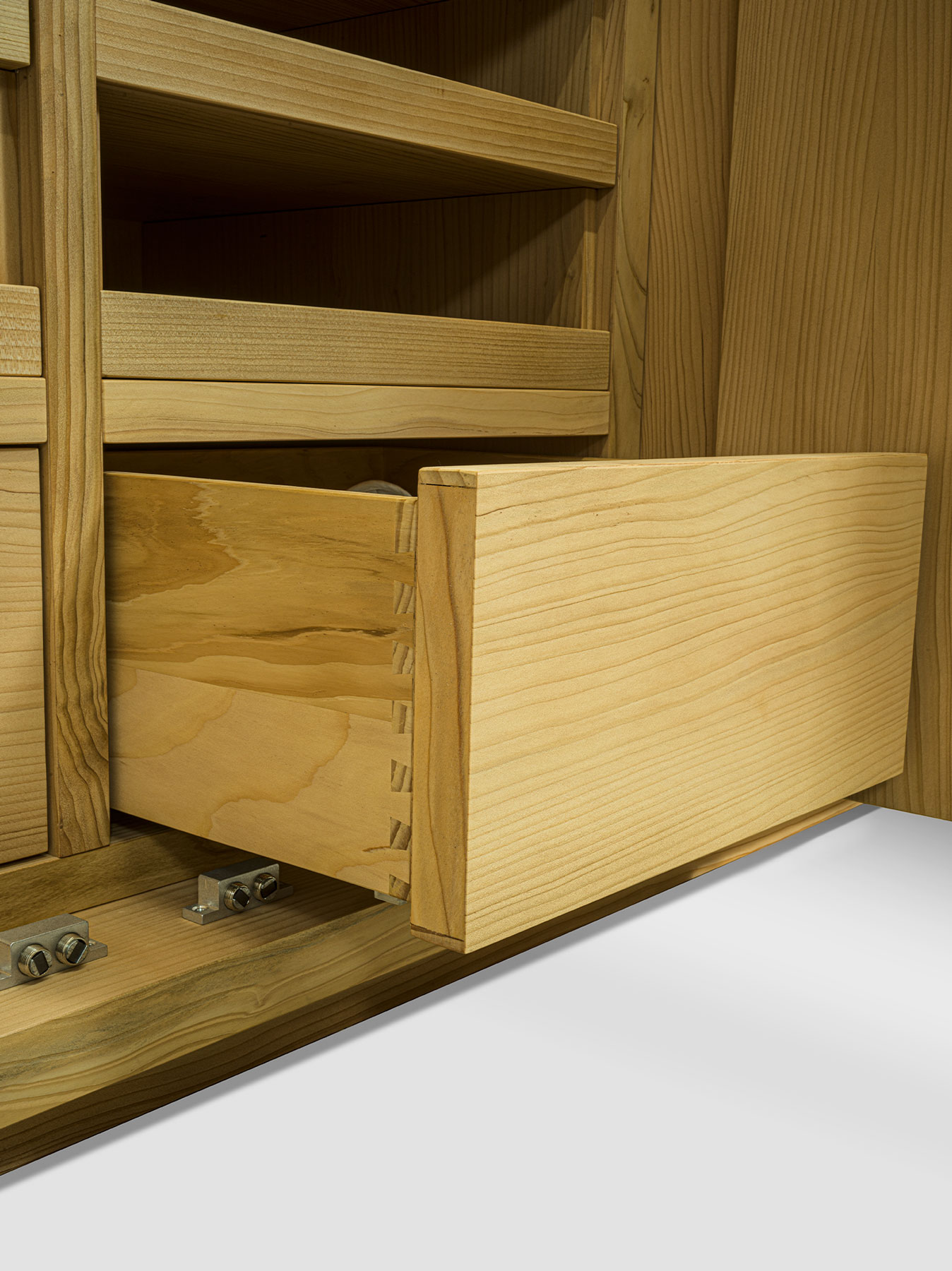Kleiderschrank aus Massivholz und Tischlerplatte, Spiegeltüren mit Massivholzrahmen, Innenausstattung aus duftendem Zedernholz, ideal gegen Kleidermotten. Funktionelle Innenausstattung, je nach Wunsch erhältlich, mit Kleiderstangen, Einlegeböden, Schubladen mit traditioneller Schwalbenschwanzverbindung usw., die eine funktionale und modulare Organisation der verschiedenen Elemente je nach Bedarf und gewünschten Abmessungen ermöglicht.