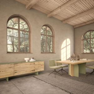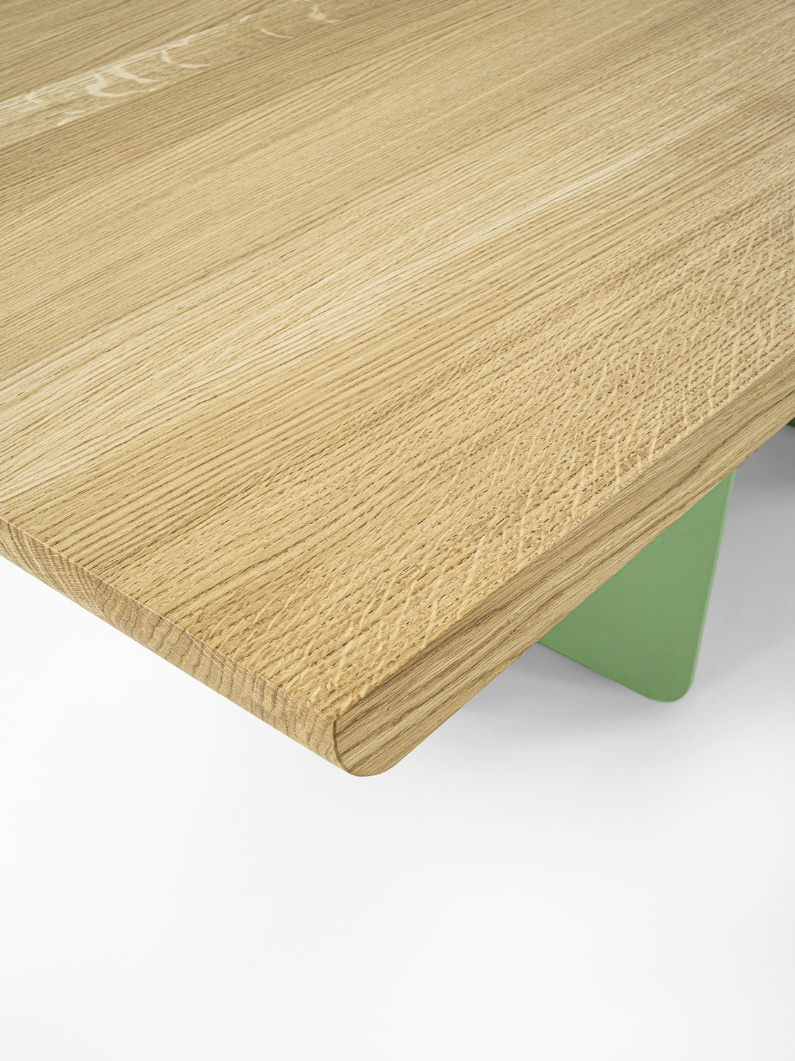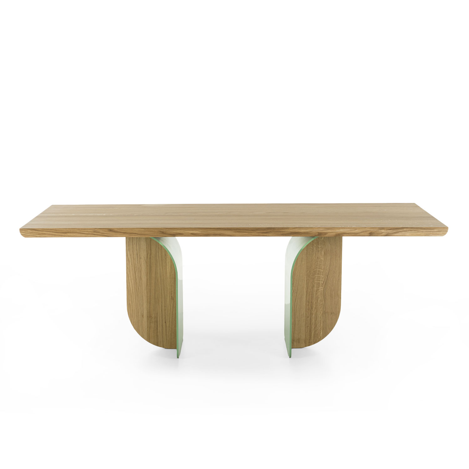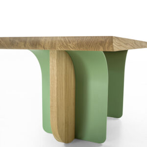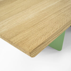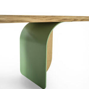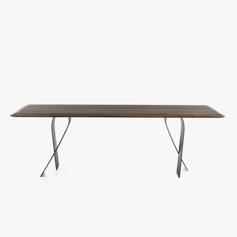 Ein Tisch mit einer Massivholzplatte aus verleimten Leisten und abgeschrägten Kanten, der sich durch seine Beine aus einer Kombination von Eisen und Holz auszeichnet, die je nach Blickwinkel unterschiedlich aussehen.