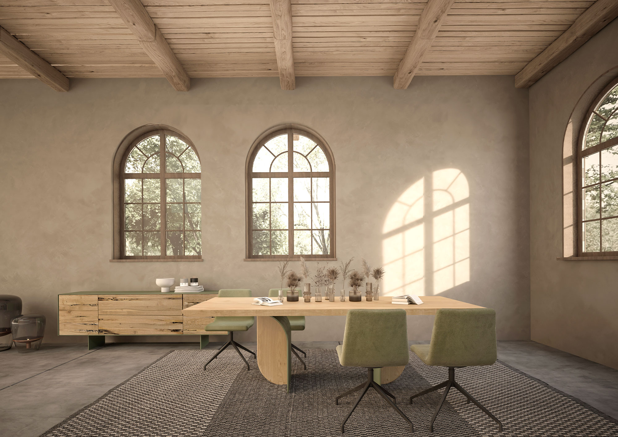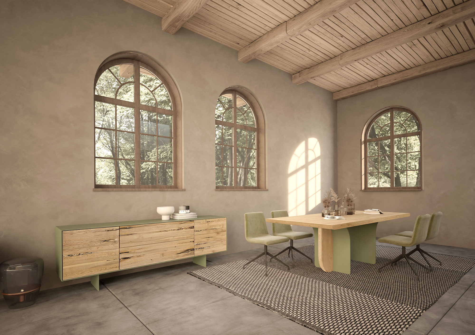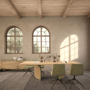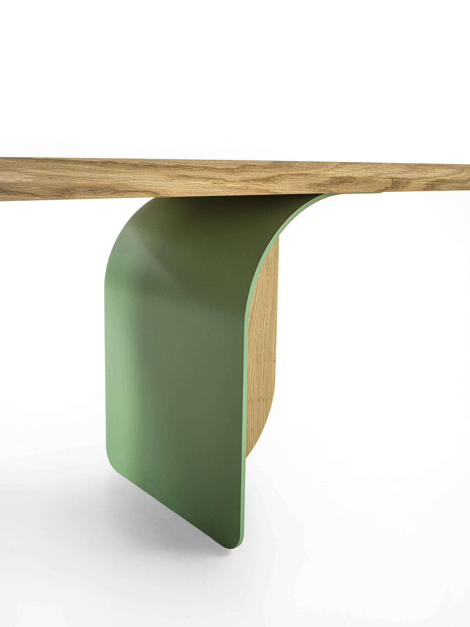 Ein Tisch mit einer Massivholzplatte aus verleimten Leisten und abgeschrägten Kanten, der sich durch seine Beine aus einer Kombination von Eisen und Holz auszeichnet, die je nach Blickwinkel unterschiedlich aussehen.