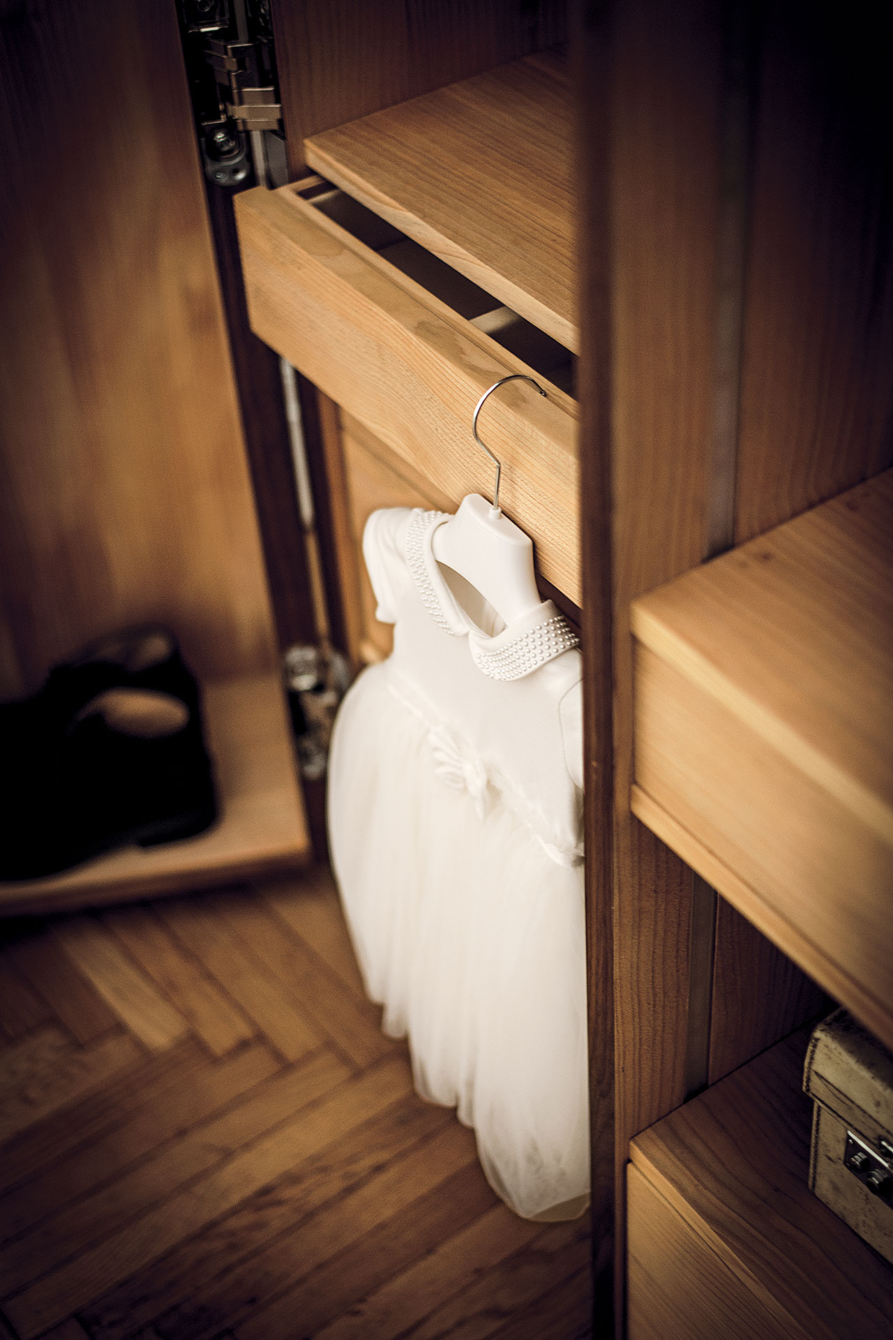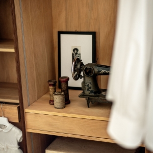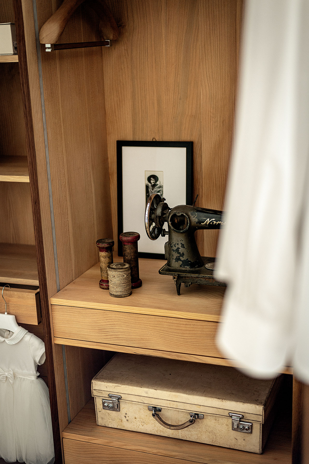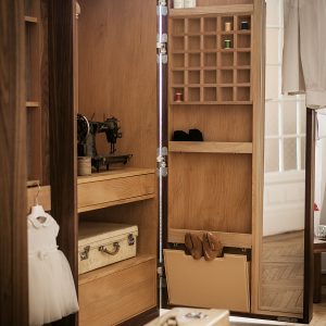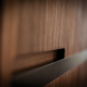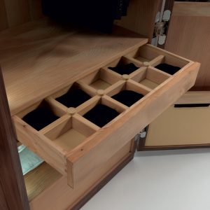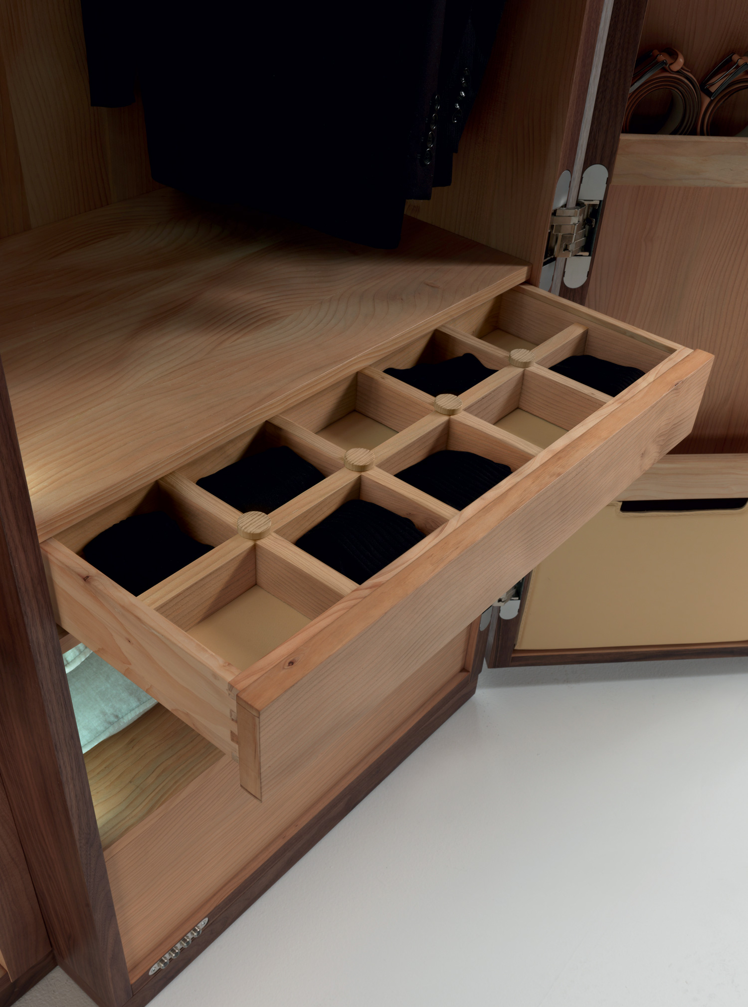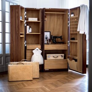 Schrank aus Tischlerplatte und Massivholz mit asymmetrischen glatten Türen mit Metallgriff. Traditionelle Schrankkoffer auf moderne Weise interpretiert, mit funktioneller Innenausstattung aus duftendem Zedernholz, ideal gegen Kleidermotten. Mit LED-Beleuchtung ausgestattet.