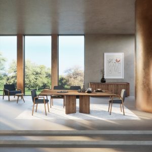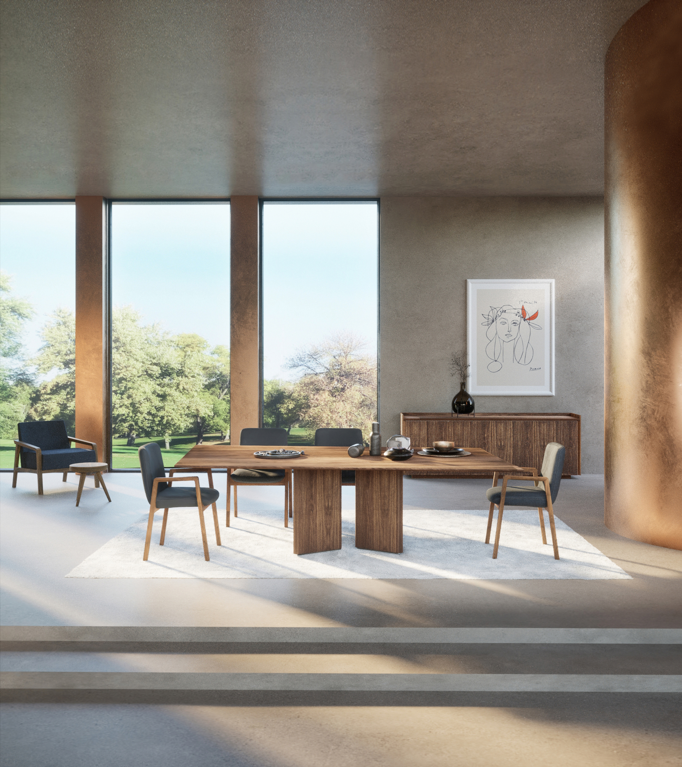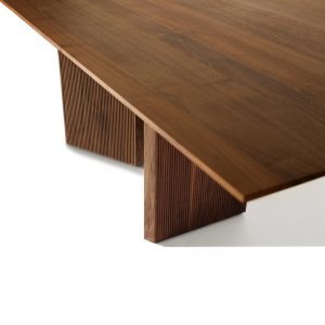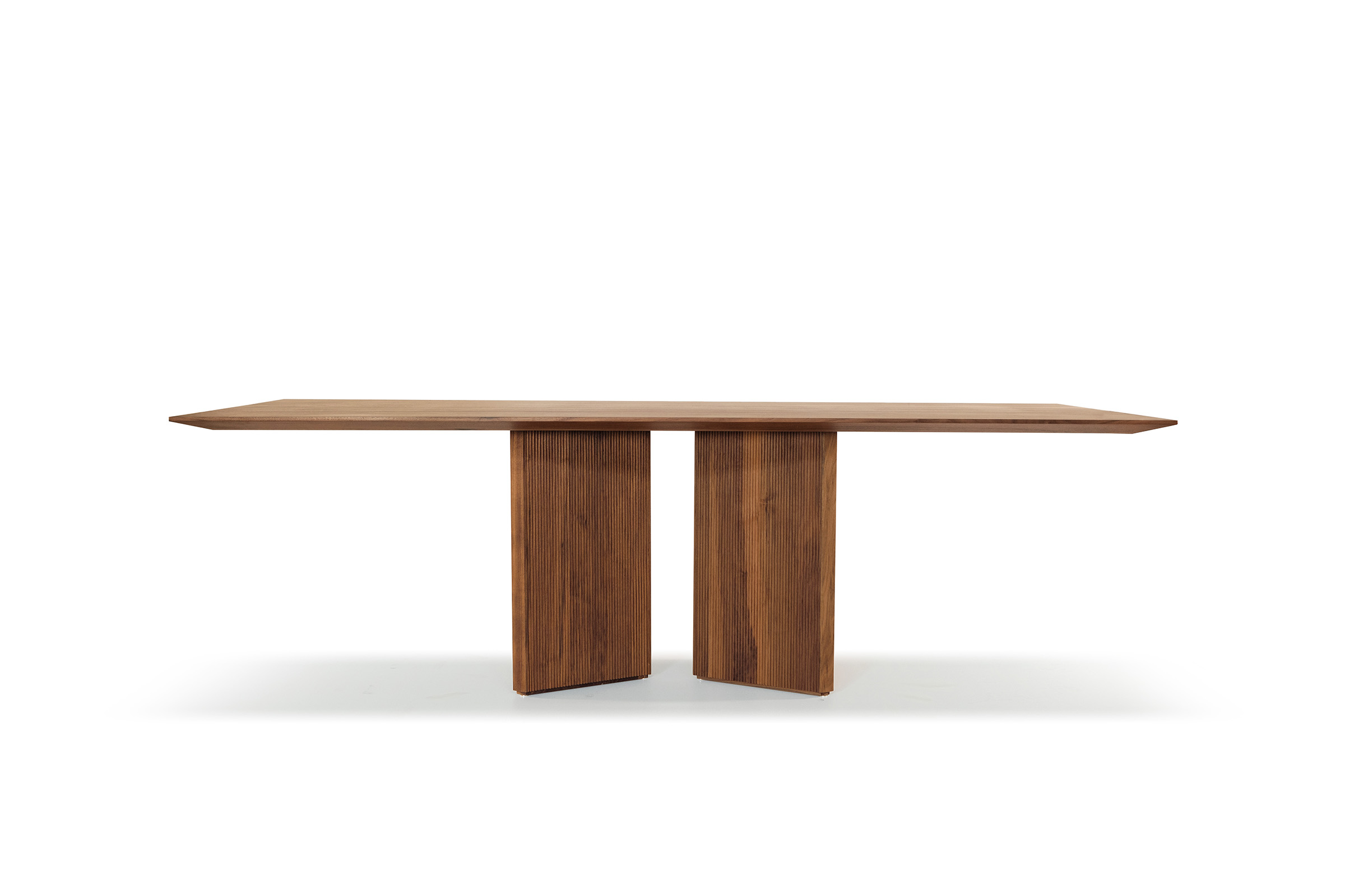 Tisch mit Platte aus Massivholz mit verleimten Leisten und dünnen Kanten. Das Gestell besteht aus prismenförmigen Beinen mit je drei Massivholzspitzen. Die Oberfläche der Beine kann glatt oder mit Verarbeitung Fresart sein, die einen modernen und dynamischen geometrischen Effekt erzeugt.