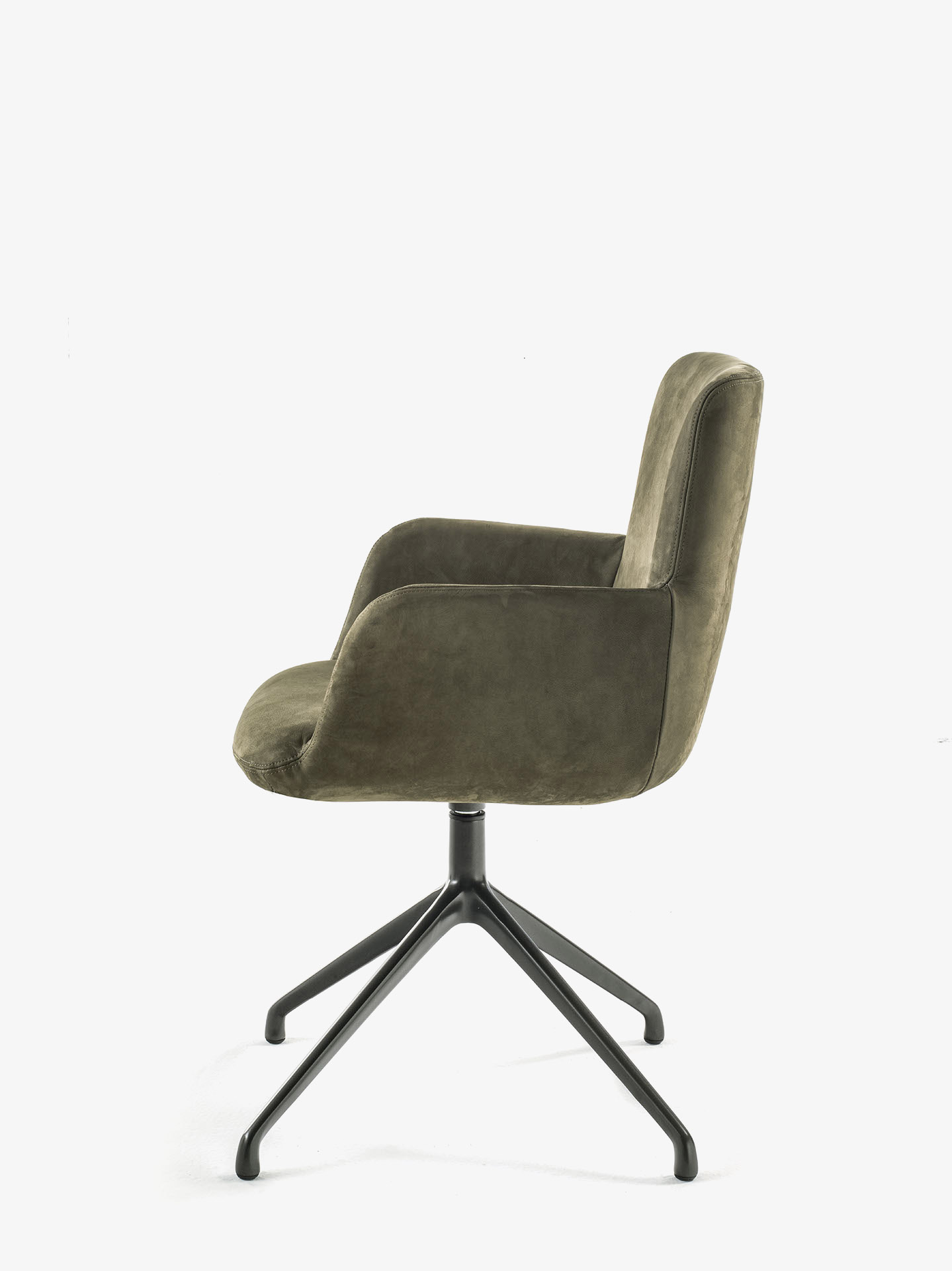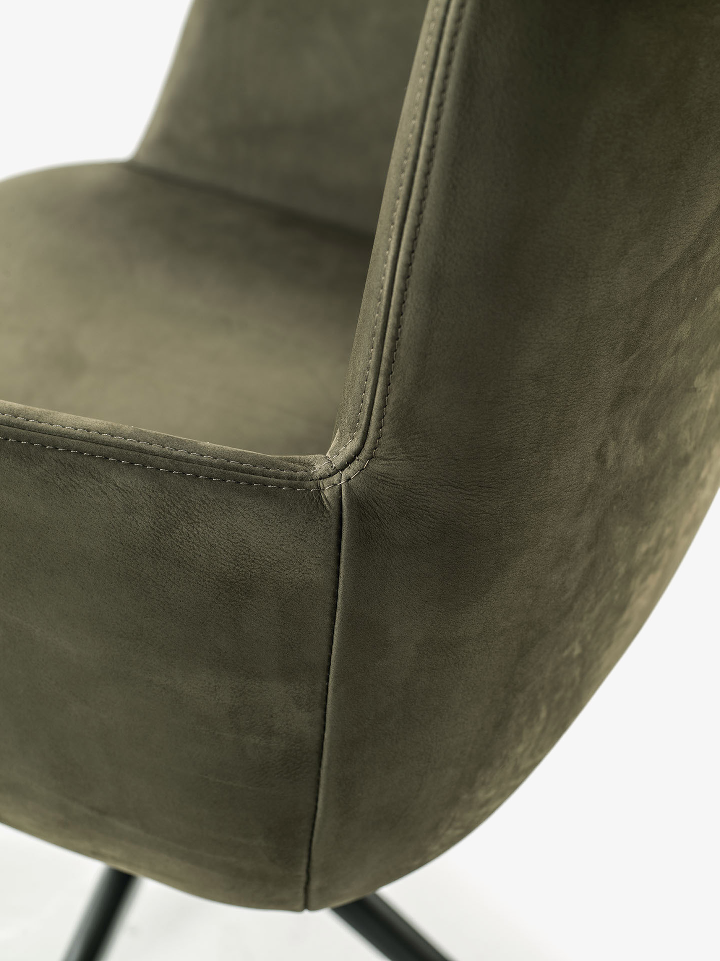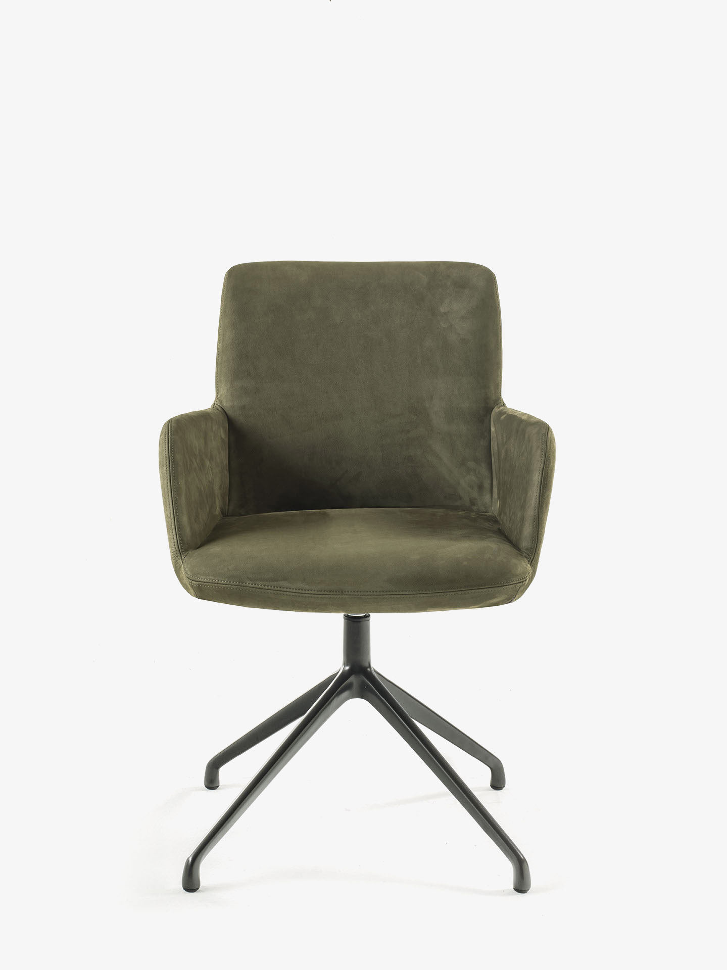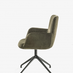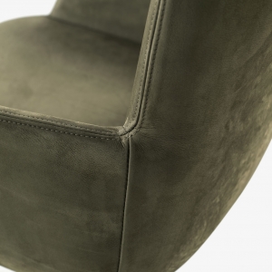 Bequemer Stuhl mit Struktur aus Polyurethanschaum. Sitzfläche, Rückenlehne und Armlehnen mit Bezug aus Leder oder Stoff mit dekorativen sichtbaren Nähten. Mit drehbarem Aluminiumgestell.