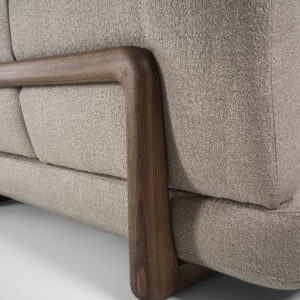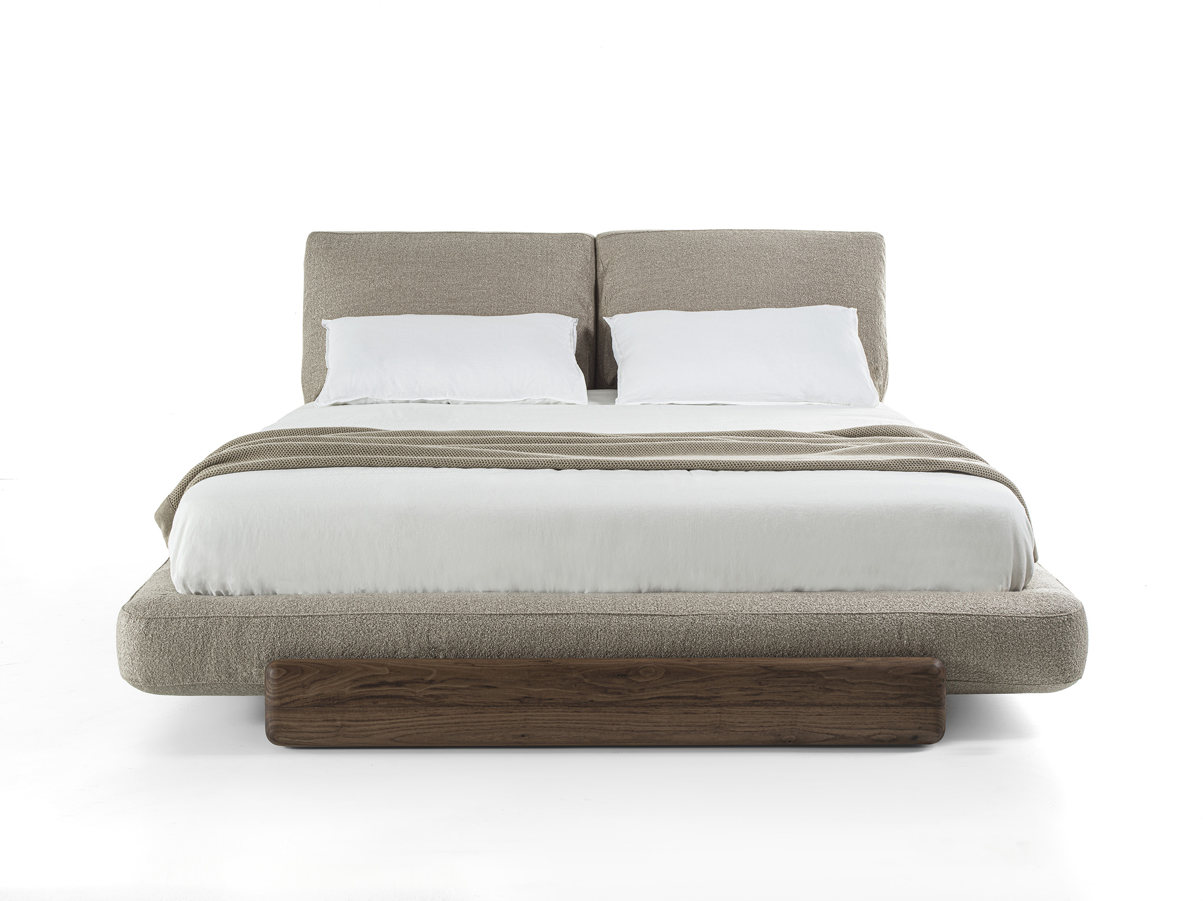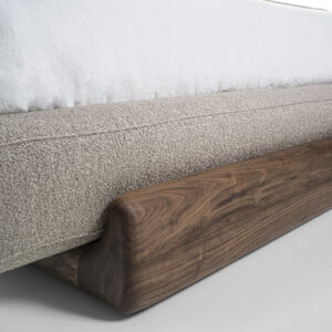 Bett mit einer Struktur, die sich aus der Verbindung zweier Komponenten mit weichen, abgerundeten Linien ergibt: der Sockel aus Massivholz, der ein gepolstertes Bettgestell aufnimmt. Kombiniert mit einem gepolsterten Kopfteil, das mit Leder oder Stoff bezogen ist.