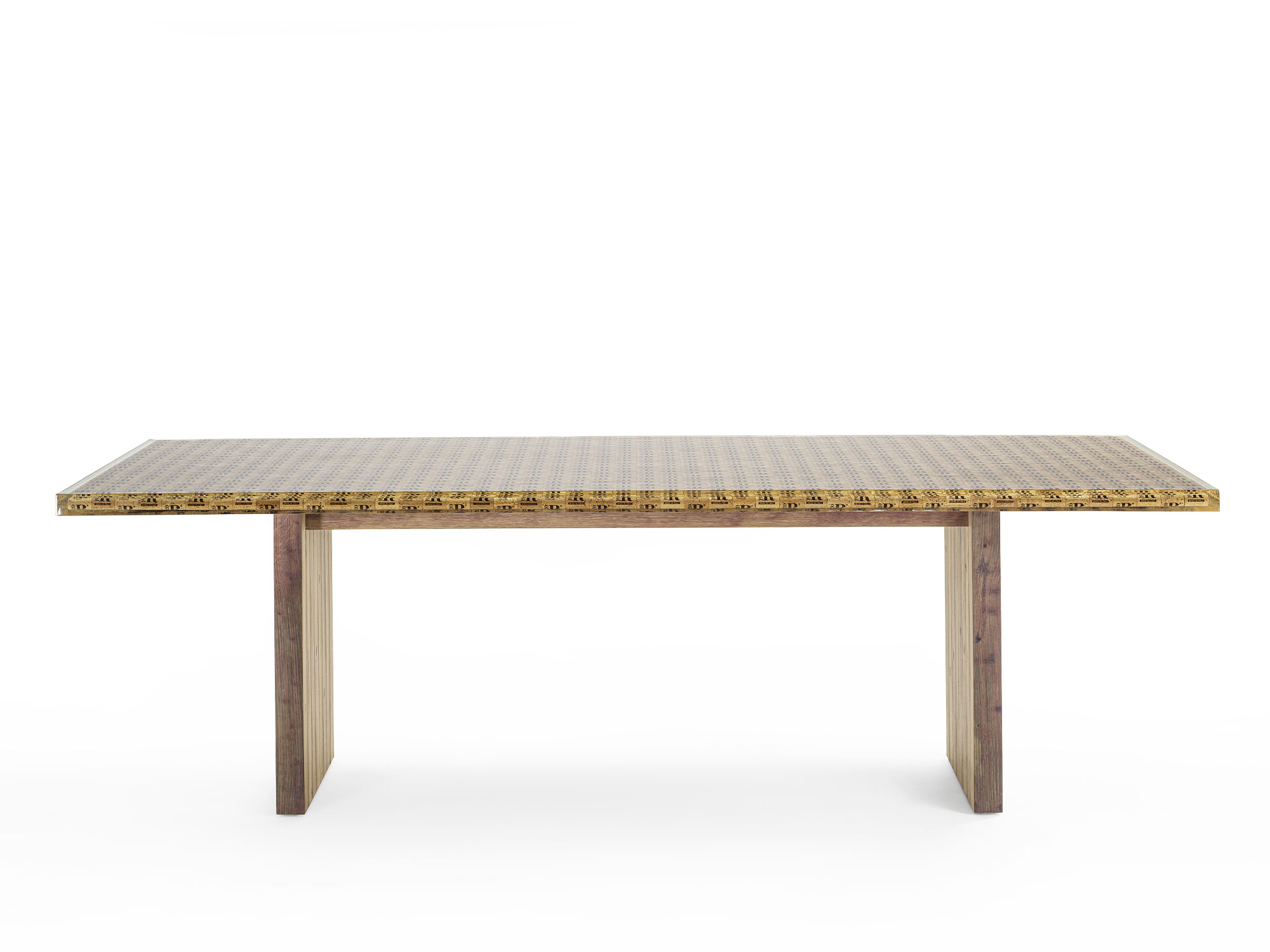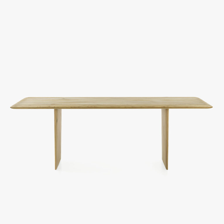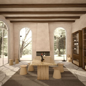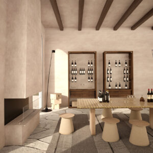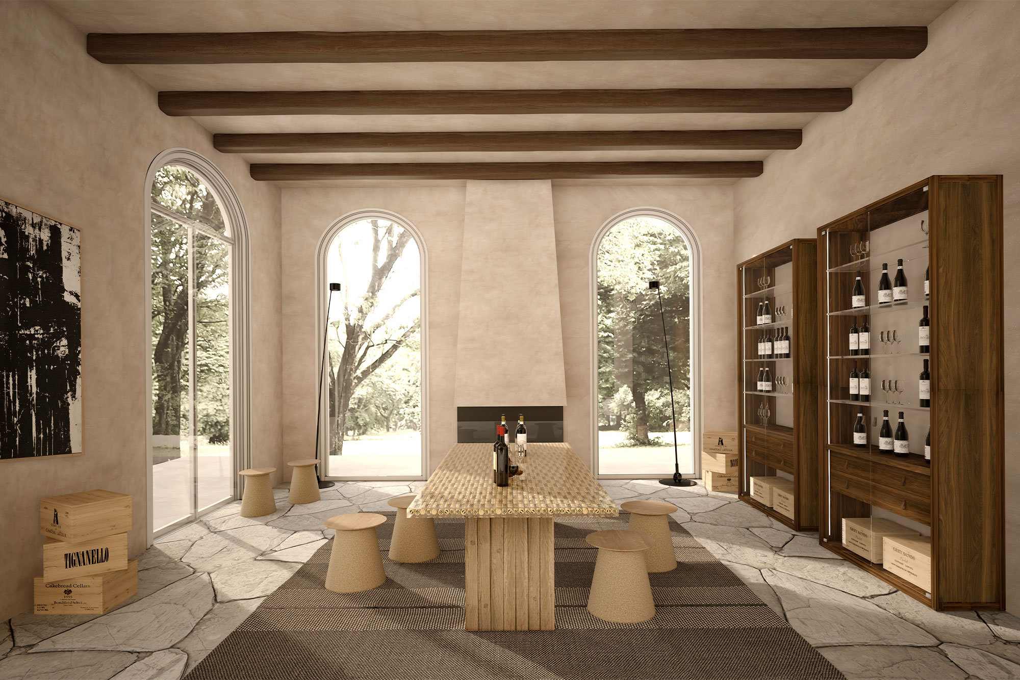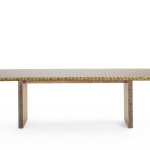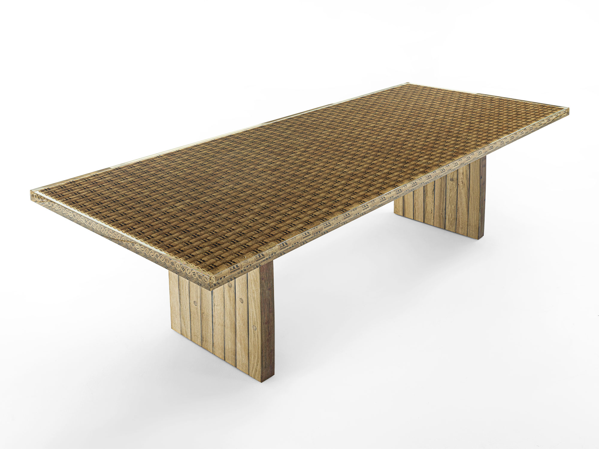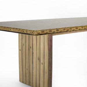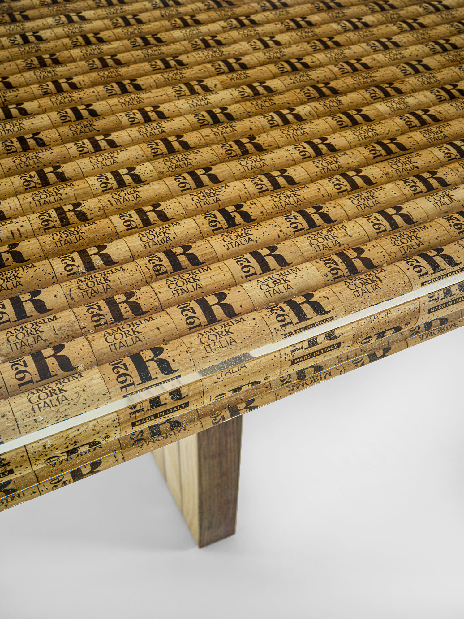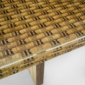Tisch mit Eichengestell aus Barrique-Latten und Platte aus Korken und Kunstharz.