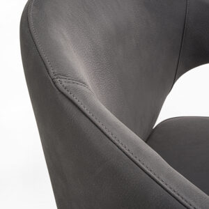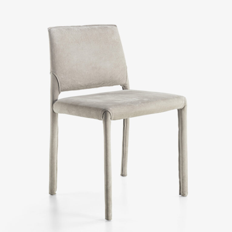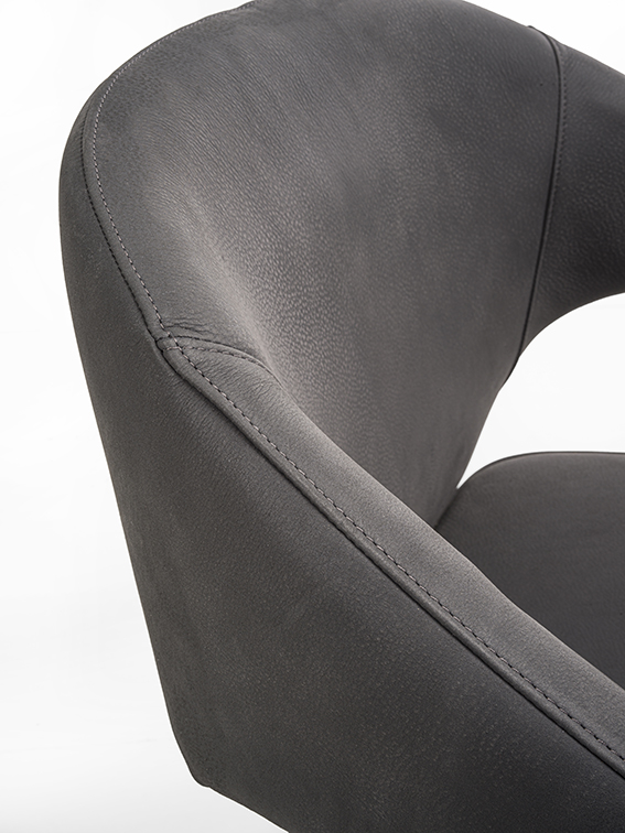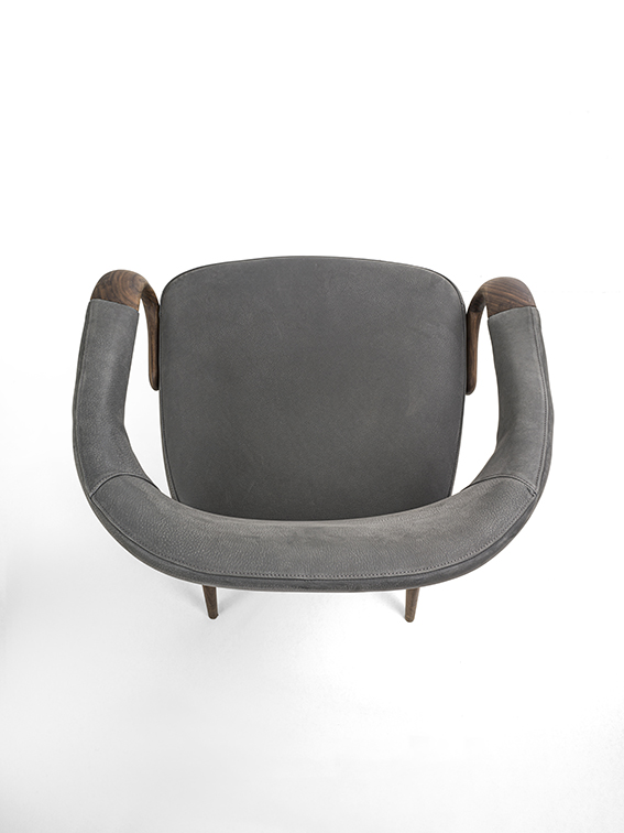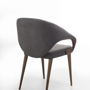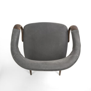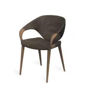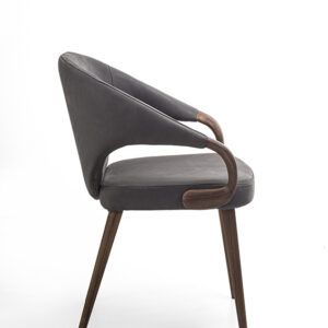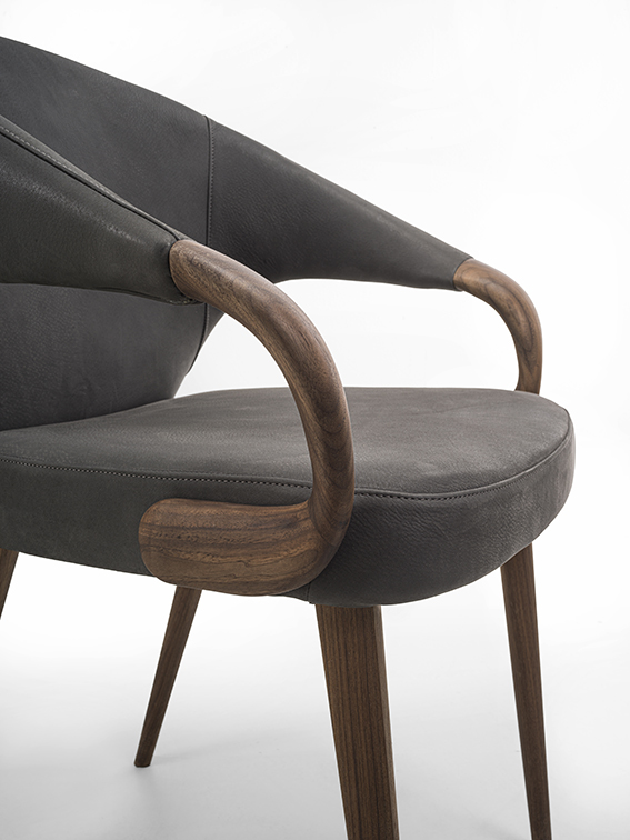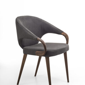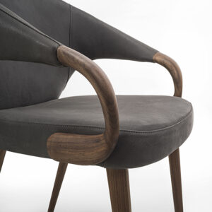 Eleganter Sessel mit Beinen und Armlehnen aus Massivholz. Sitz und Rückenlehne mit Leder oder Stoff bezogen.