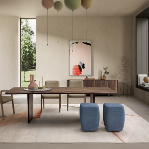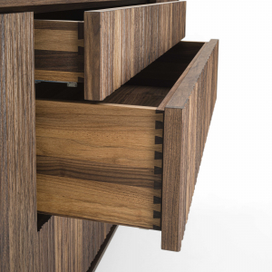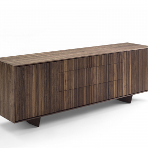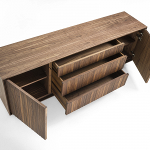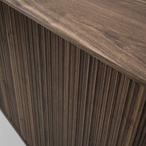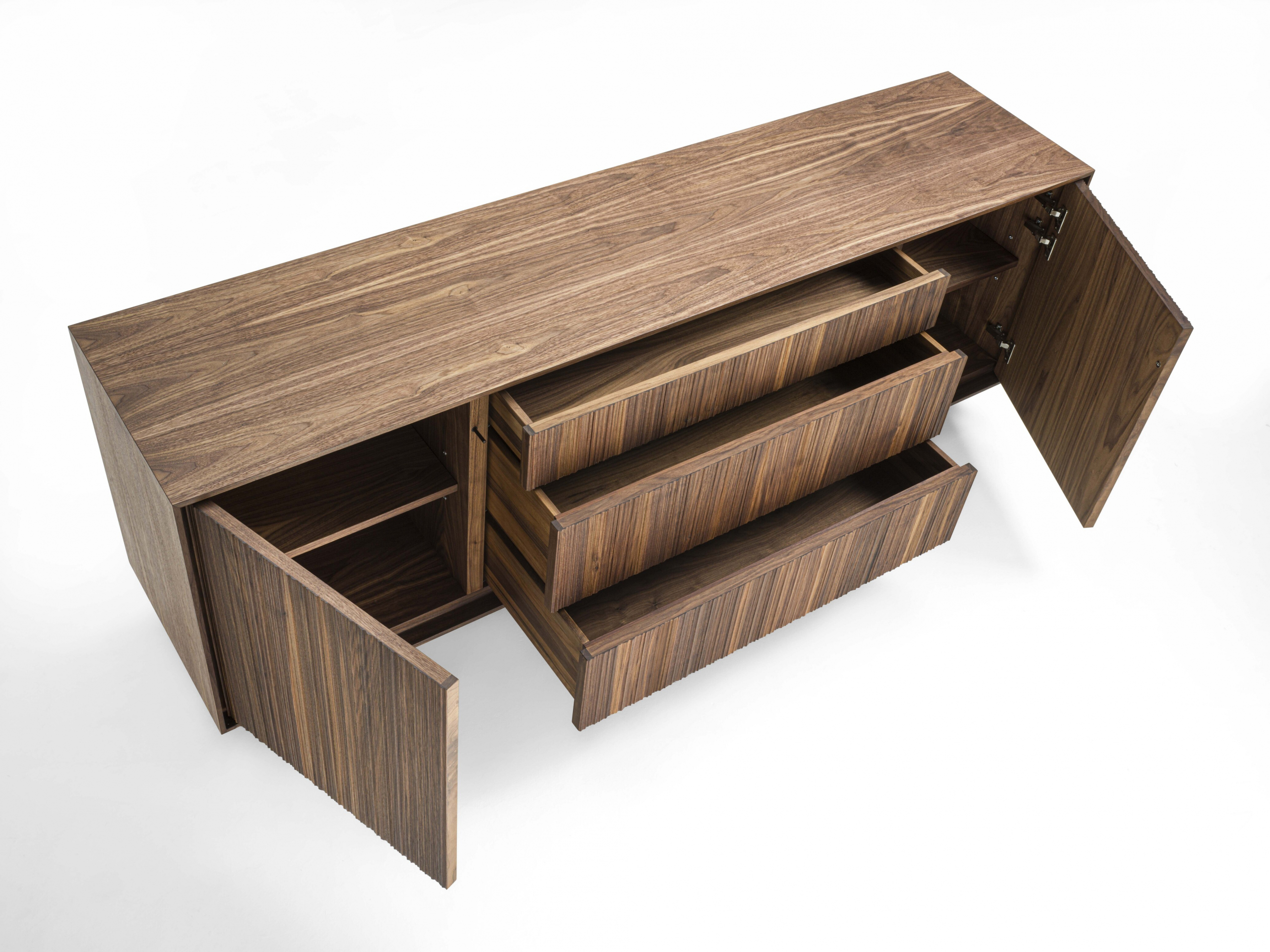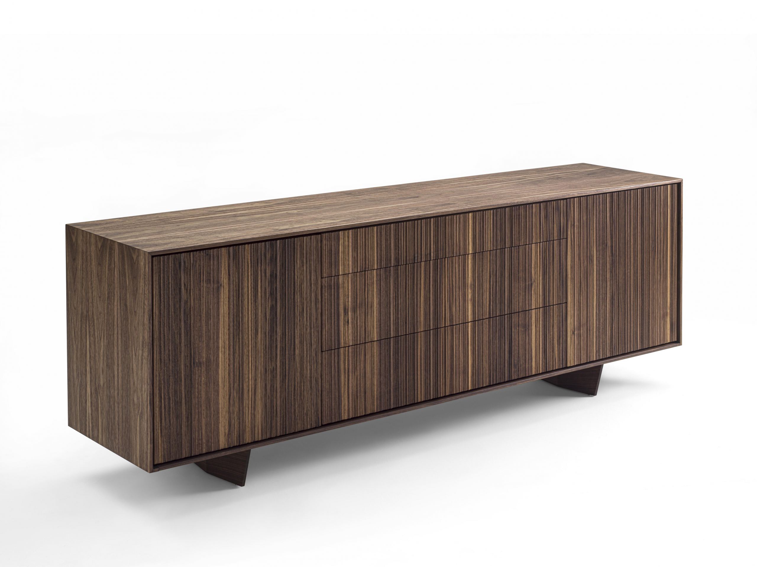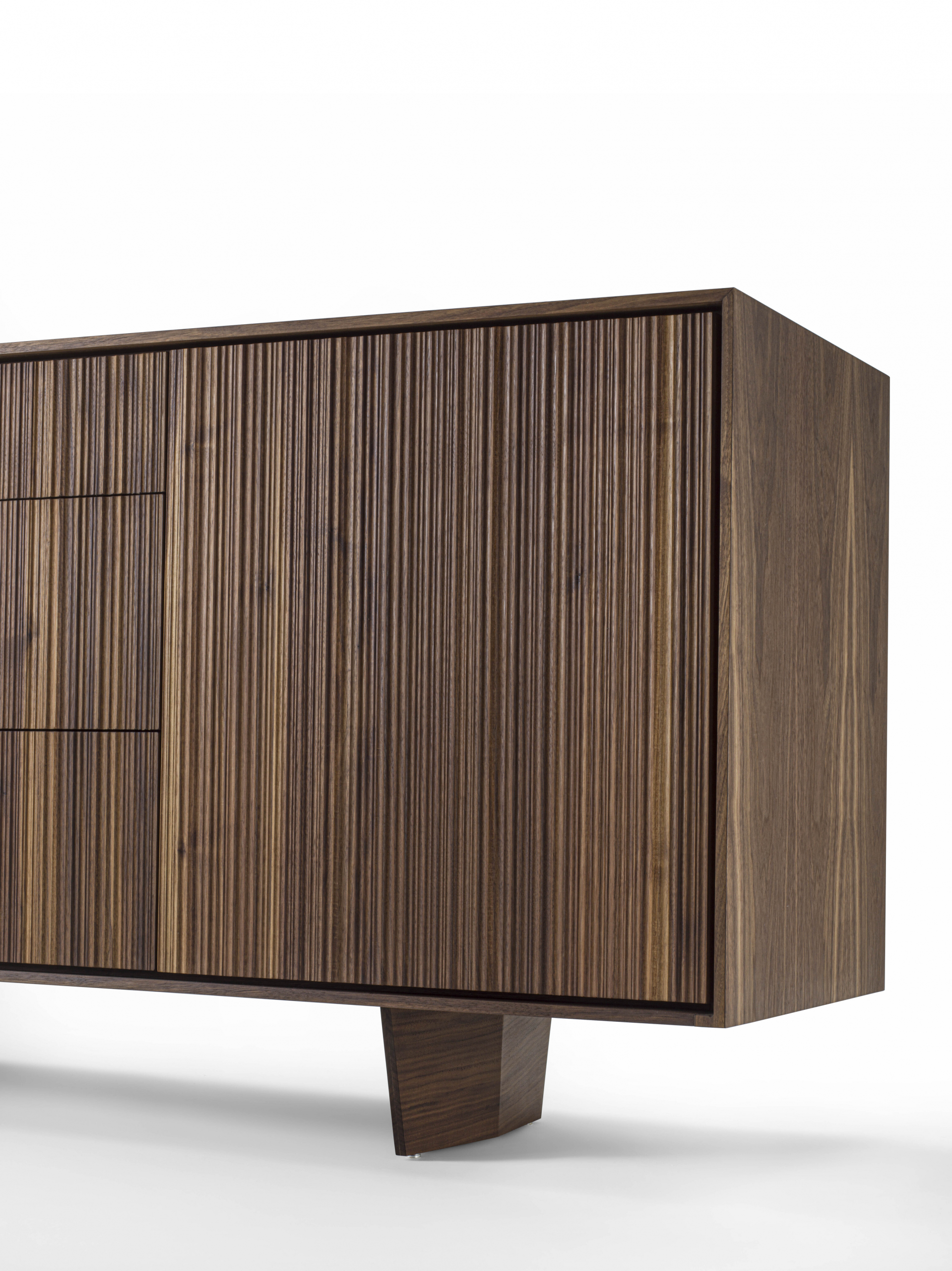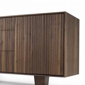 Sideboard aus Massivholz und Tischlerplatte, gekennzeichnet durch eine besondere vertikale Verarbeitung von Türen und Schubladenfronten, die einen modernen und dynamischen geometrischen Effekt erzeugt.