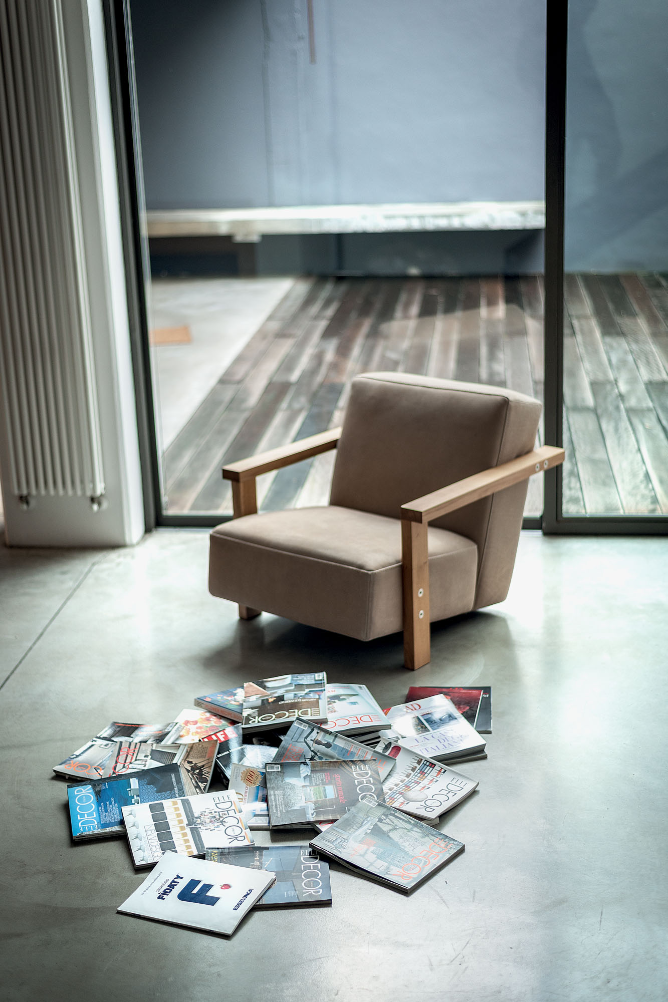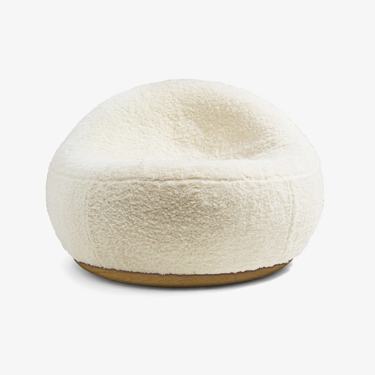 Padded armchair with fabric or leather upholstery and visible stitching. Armrests in solid wood are the supporting structure for the seat.