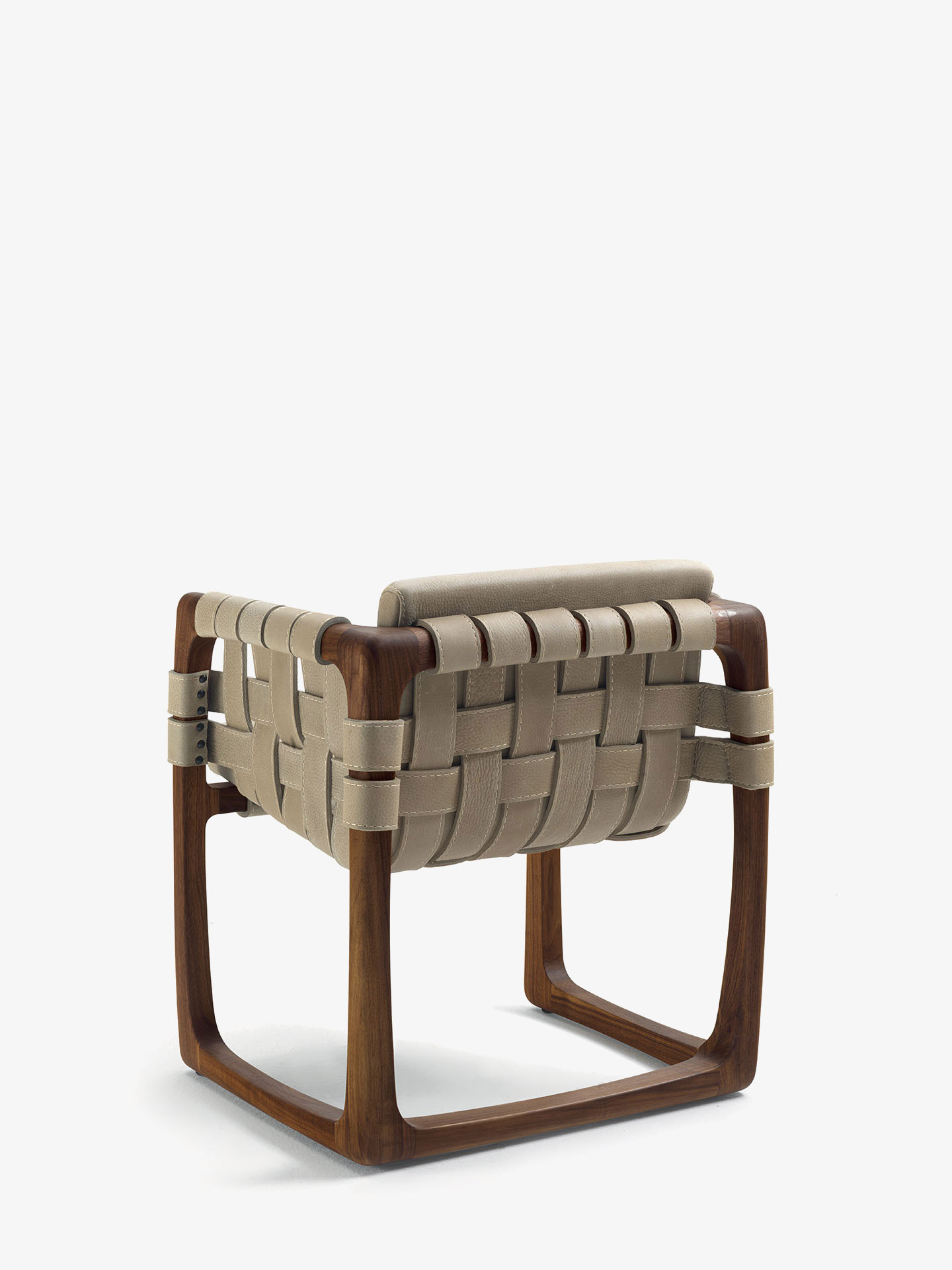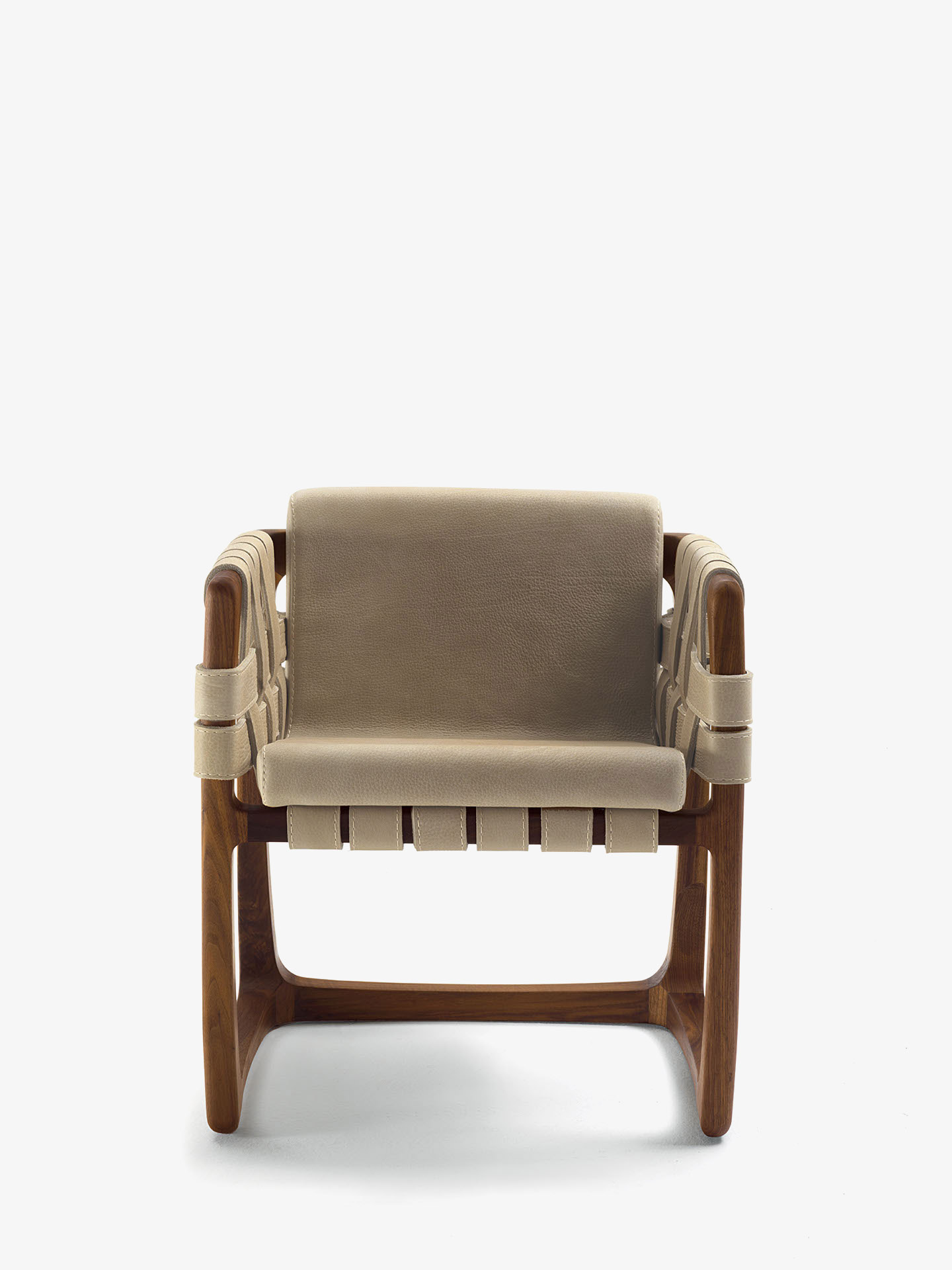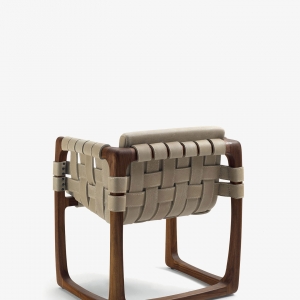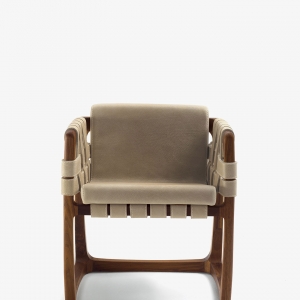 Padded chair with structure in solid wood turned, assembled and sanded completely by hand. An original detail are the strips of leather or fabric running both under the seat, on the backrest and on the armrests. When in fabric these strips have a structural support inside.