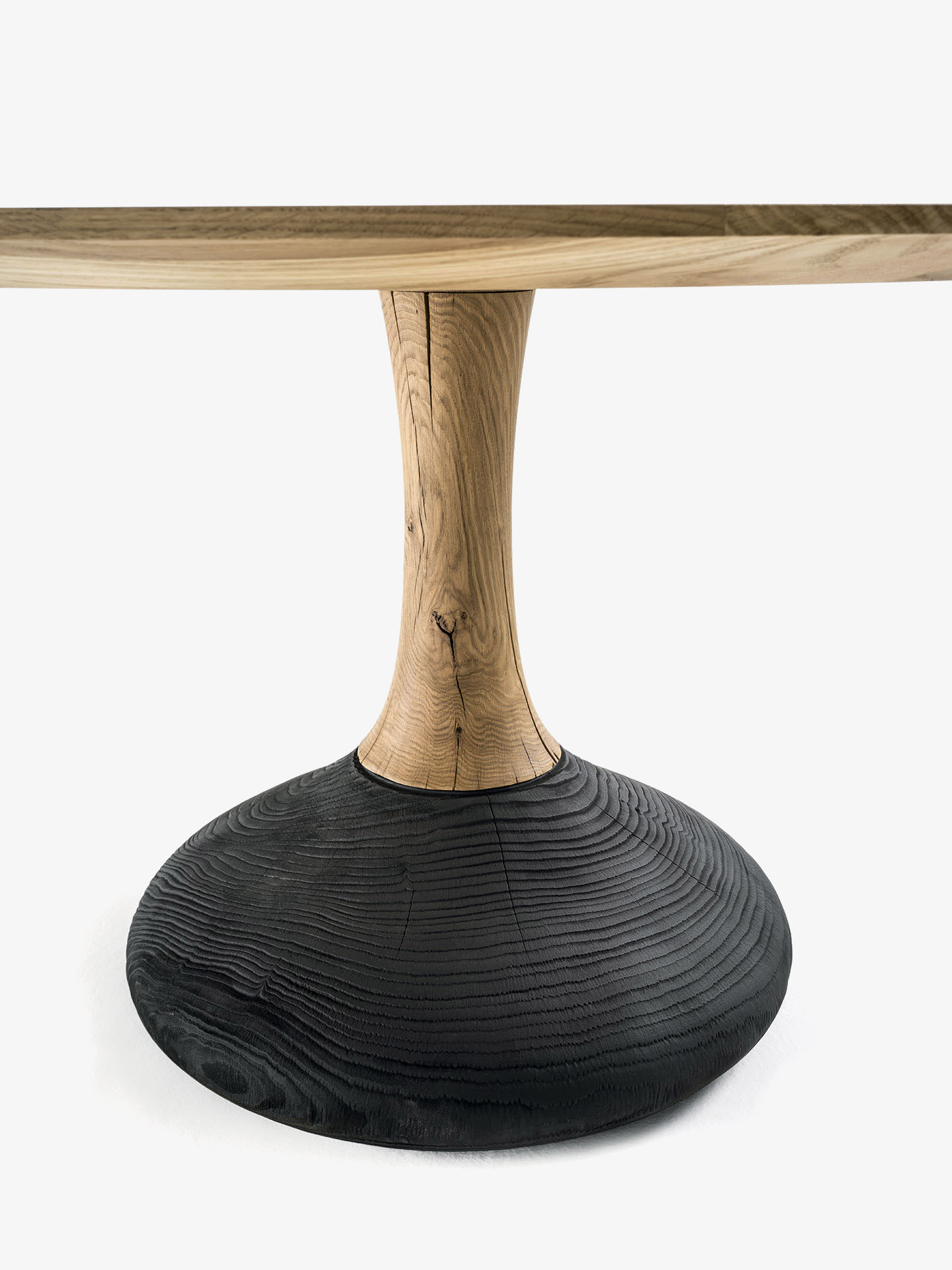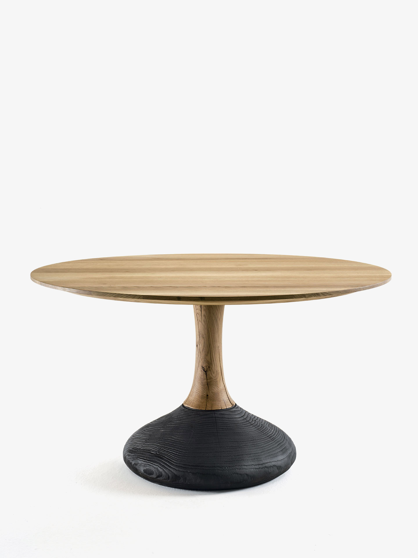 Round or square table with top in solid wood in glued lists. Base composed of a central leg in the same wood as the top and lower part in vulcano cedar.