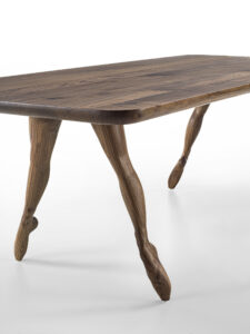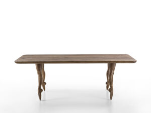 Table made with solid wood top in glued lists, characterized by rounded corners. Rounded sides on part of the top. The base is composed of 4 oblique legs, of which two resemble the legs of a dancer.