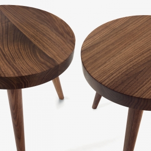 Round small table in solid wood characterized by a thick top and three legs.