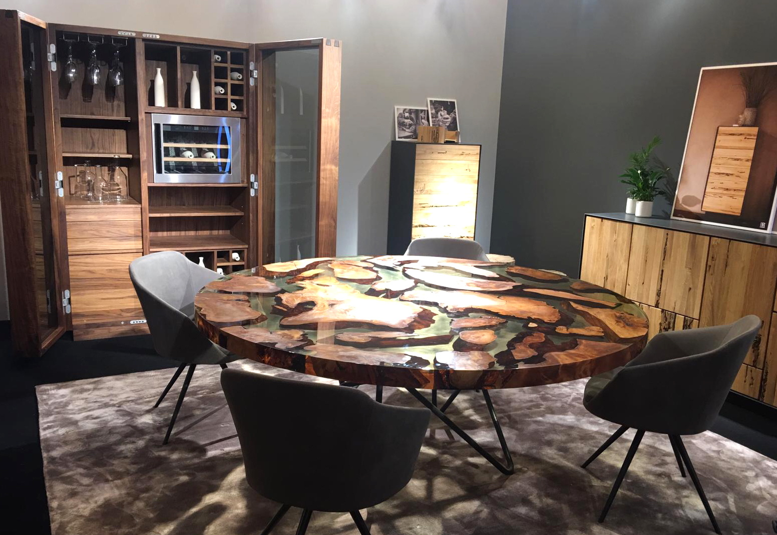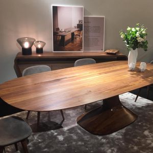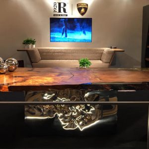 Two iconic tables, Earth and Riflessi Millenari, featuring a steel base designed by Helidon Xhixha, celebrate the millennial kauri wood, dated at 50,000 years.