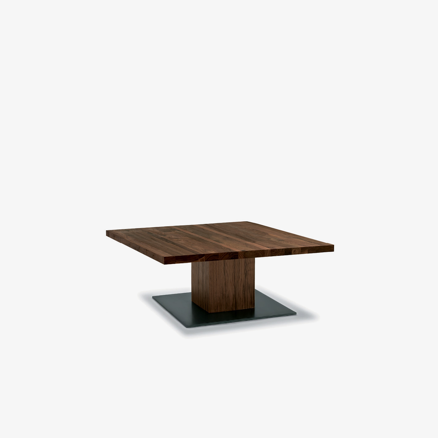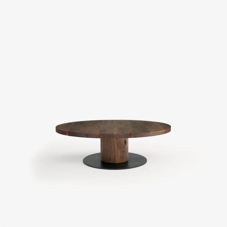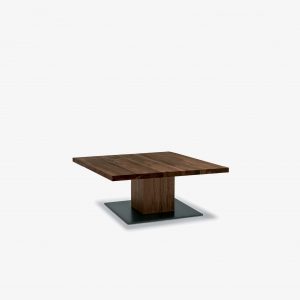 Tavolino quadrato o rettangolare realizzato interamente in legno massello, con gamba a liste incollate vuota all’interno e piastra a pavimento in ferro.