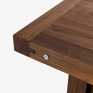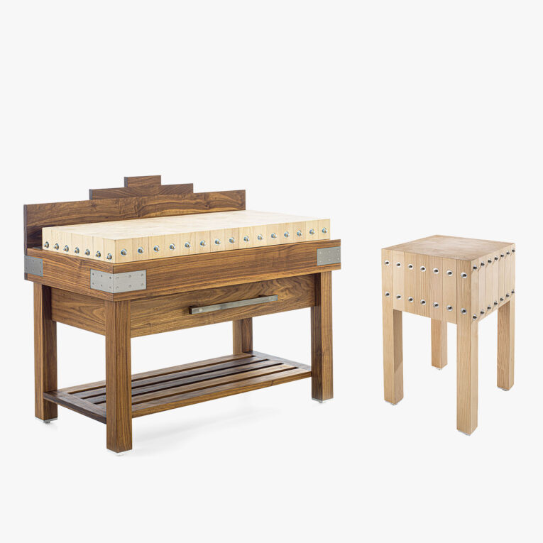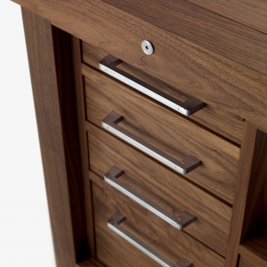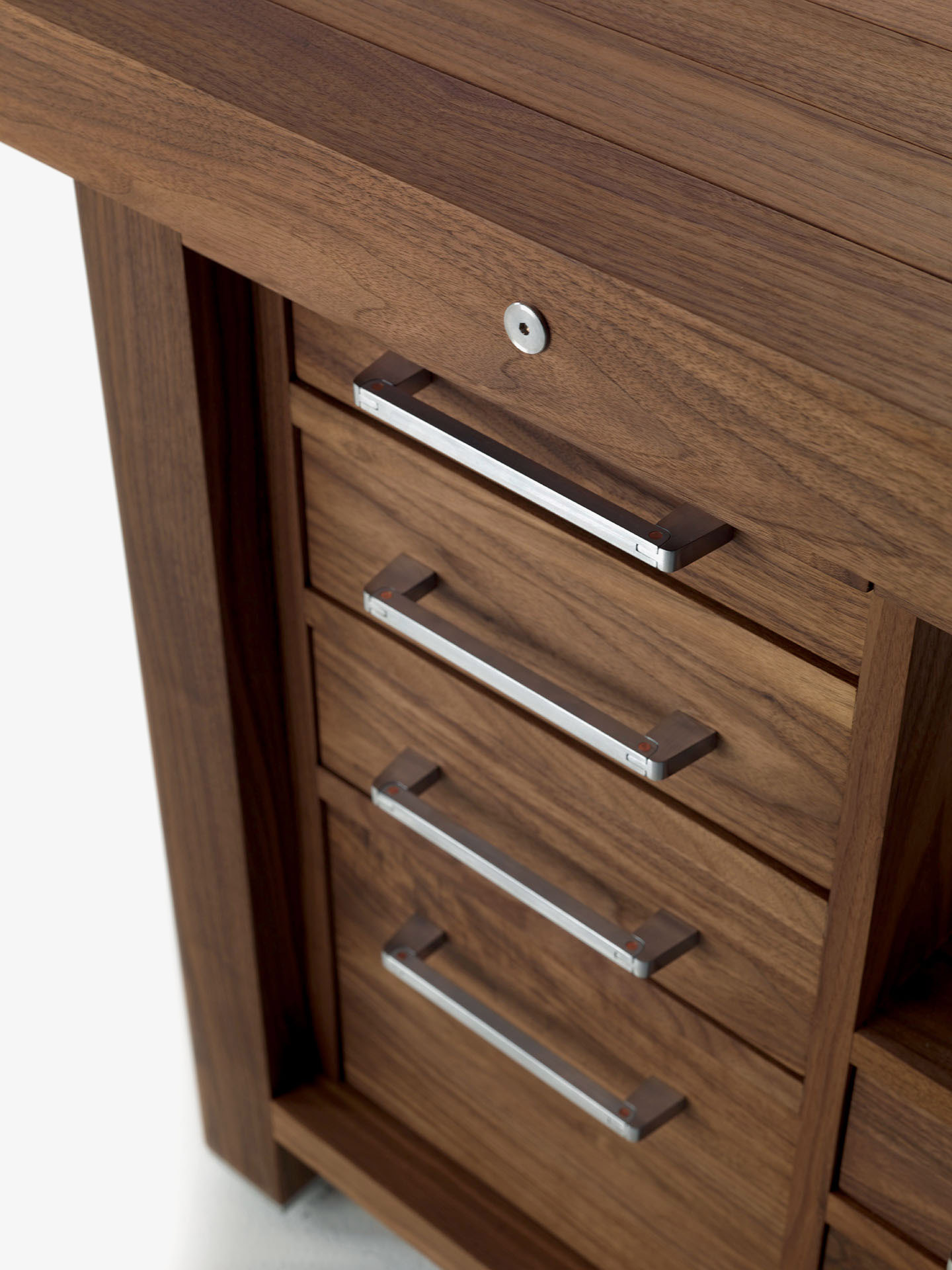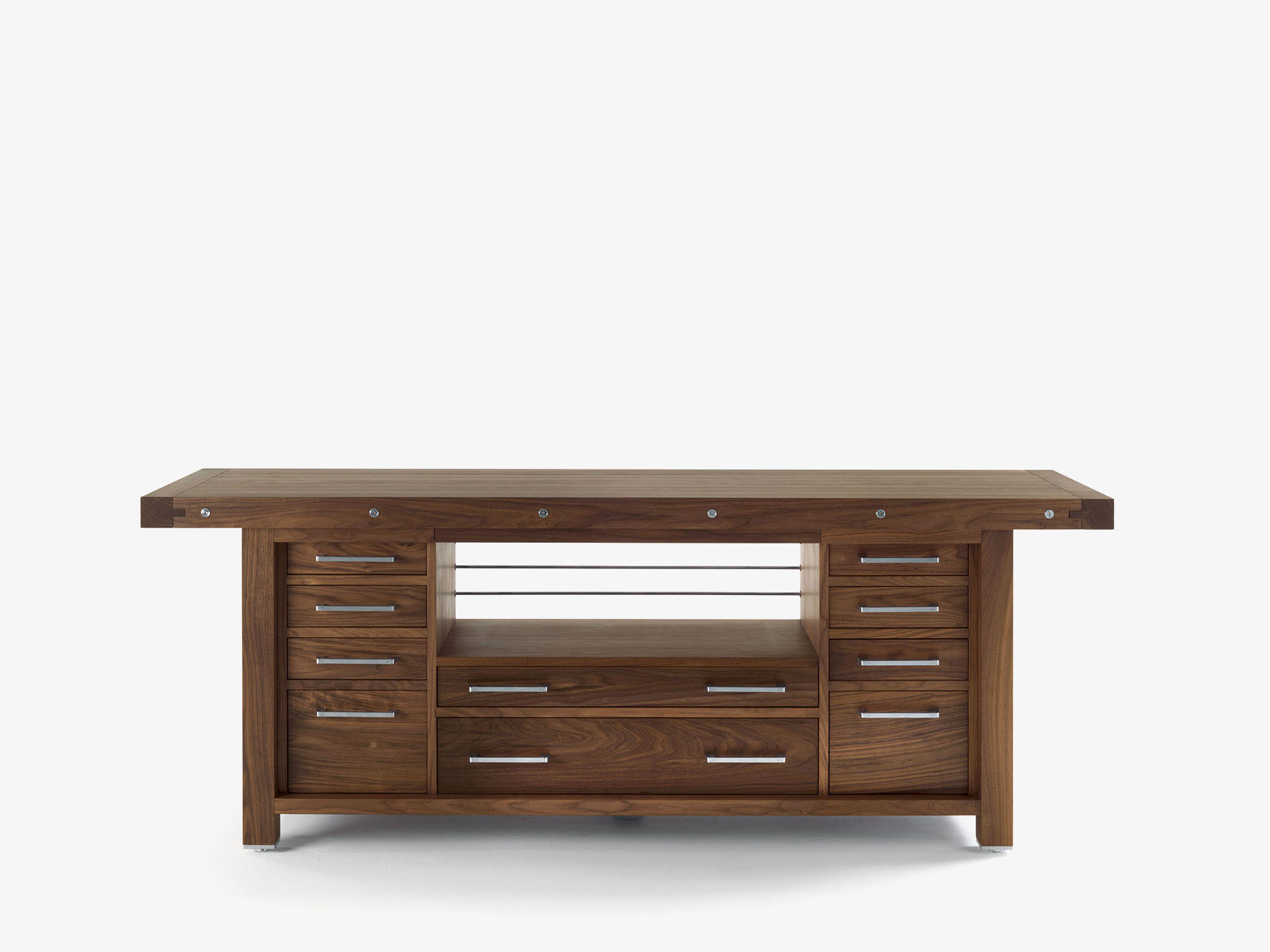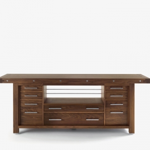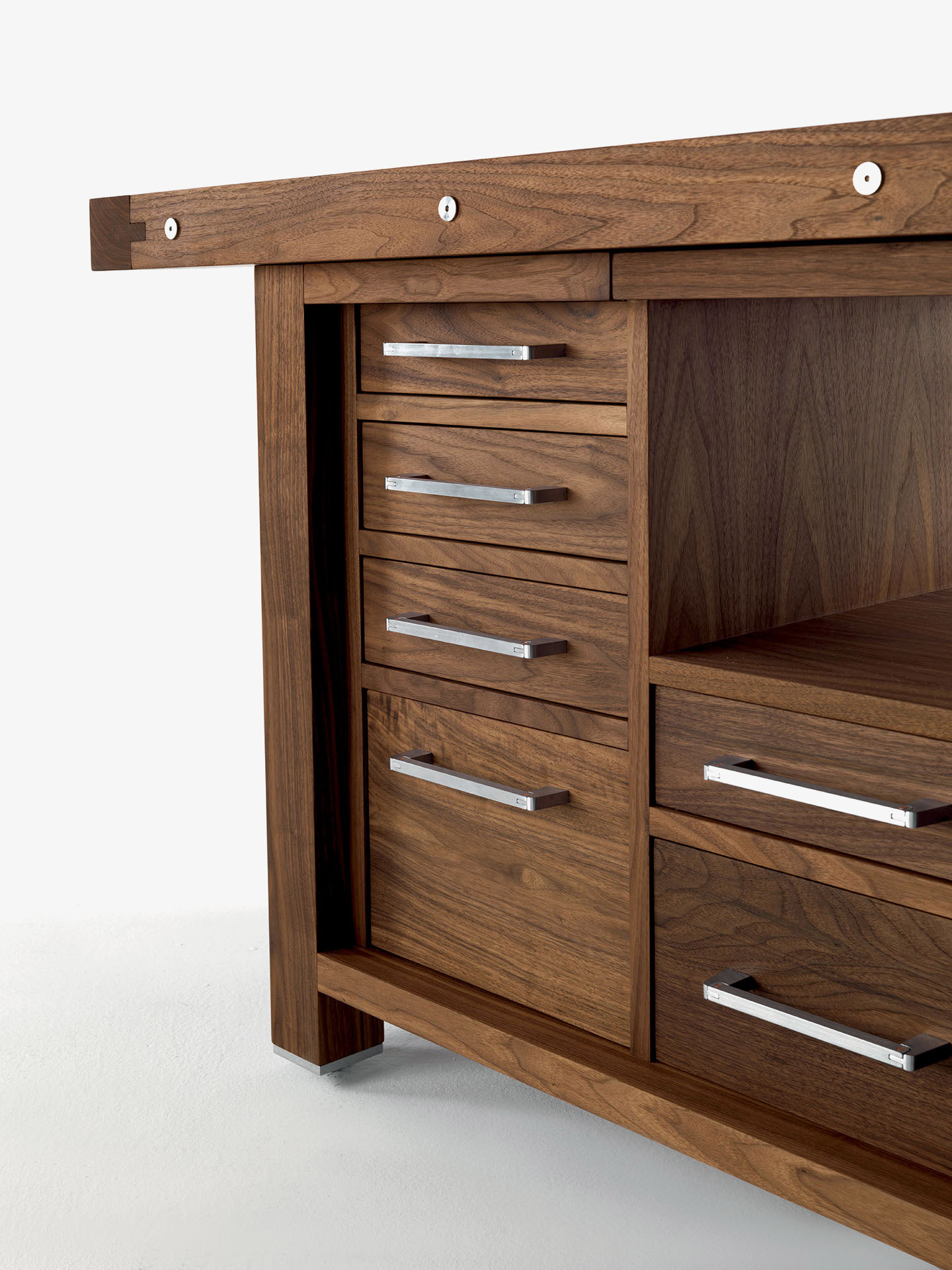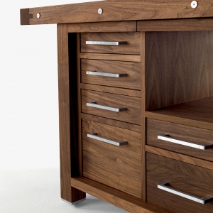 Credenza interamente realizzata in legno massello, dotata di ampio piano lavoro e cassetti assemblati con incastri a coda di rondine. Piedini in massello rialzano il mobile da terra.