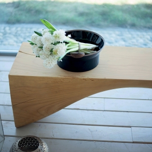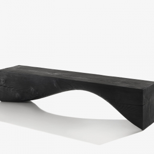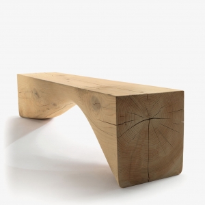 Panca in legno massello di cedro profumato lavorato da un blocco unico, caratterizzata dalla forma arcuata al di sotto del piano di seduta che esalta le venature e le sfumature del cedro naturale.