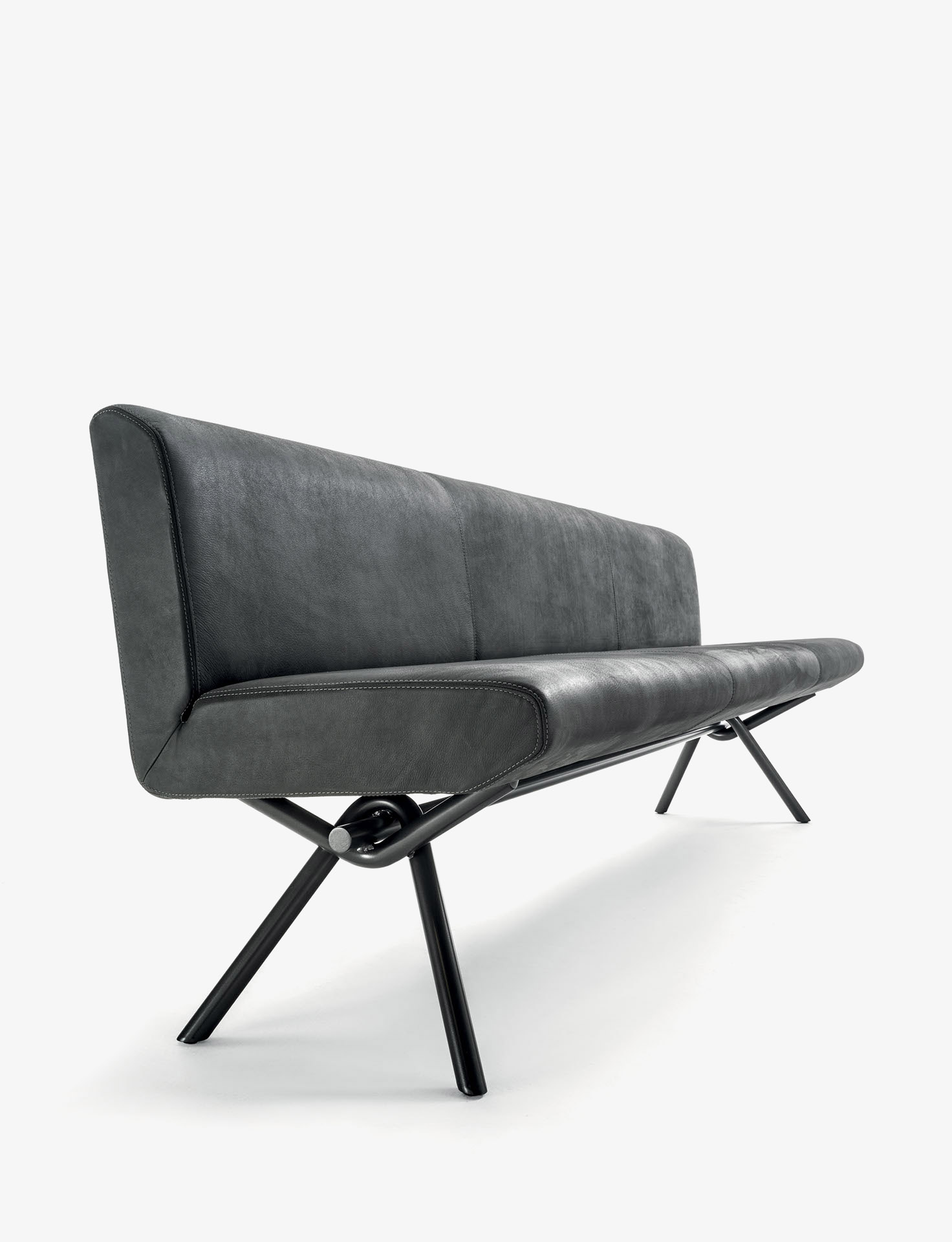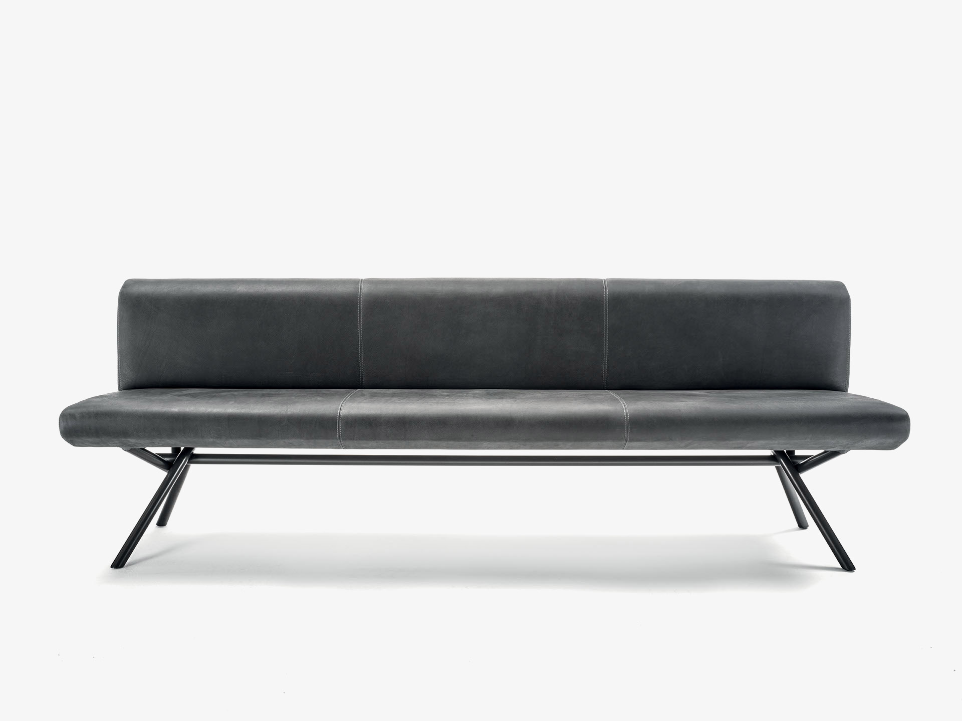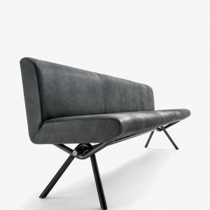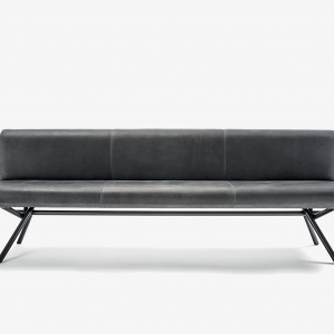 Panca con scocca realizzata in legno listellare, con seduta e schienale imbottiti e rivestiti in pelle o tessuto con cuciture a vista, abbinata ad una base essenziale e lineare formata da un tubolare intrecciato in ferro vuoto. Disponibile a richiesta in tubolare intrecciato in ferro pieno.