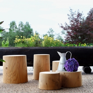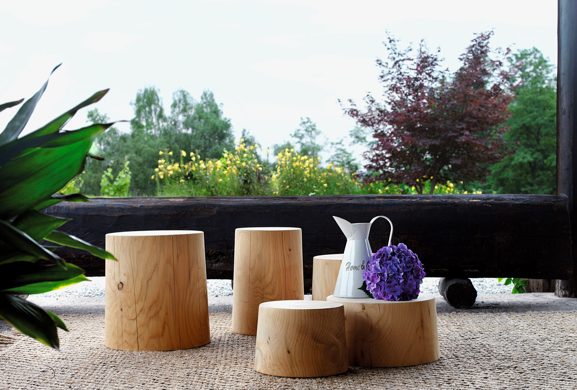 Serie di tavolini in legno massello di cedro profumato, disponibili in differenti diametri e altezze, lavorati da sezioni di tronco blocco unico, che mettono in evidenza i caratteristici anelli concentrici dell’albero.