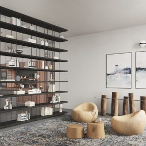 Libreria realizzata in legno massello e listellare, caratterizzata da mensole distanziate da sottili elementi in acciaio inossidabile. Flessibile sulla base delle esigenze d’arredo vede la possibilità di inserimento di moduli con anta a battente o cassetti assemblati con incastri a coda di rondine e maniglia ad incasso laterale. A richiesta è disponibile con elementi “bifacciali” e può essere utilizzata come elemento divisorio all’interno dell’ambiente.