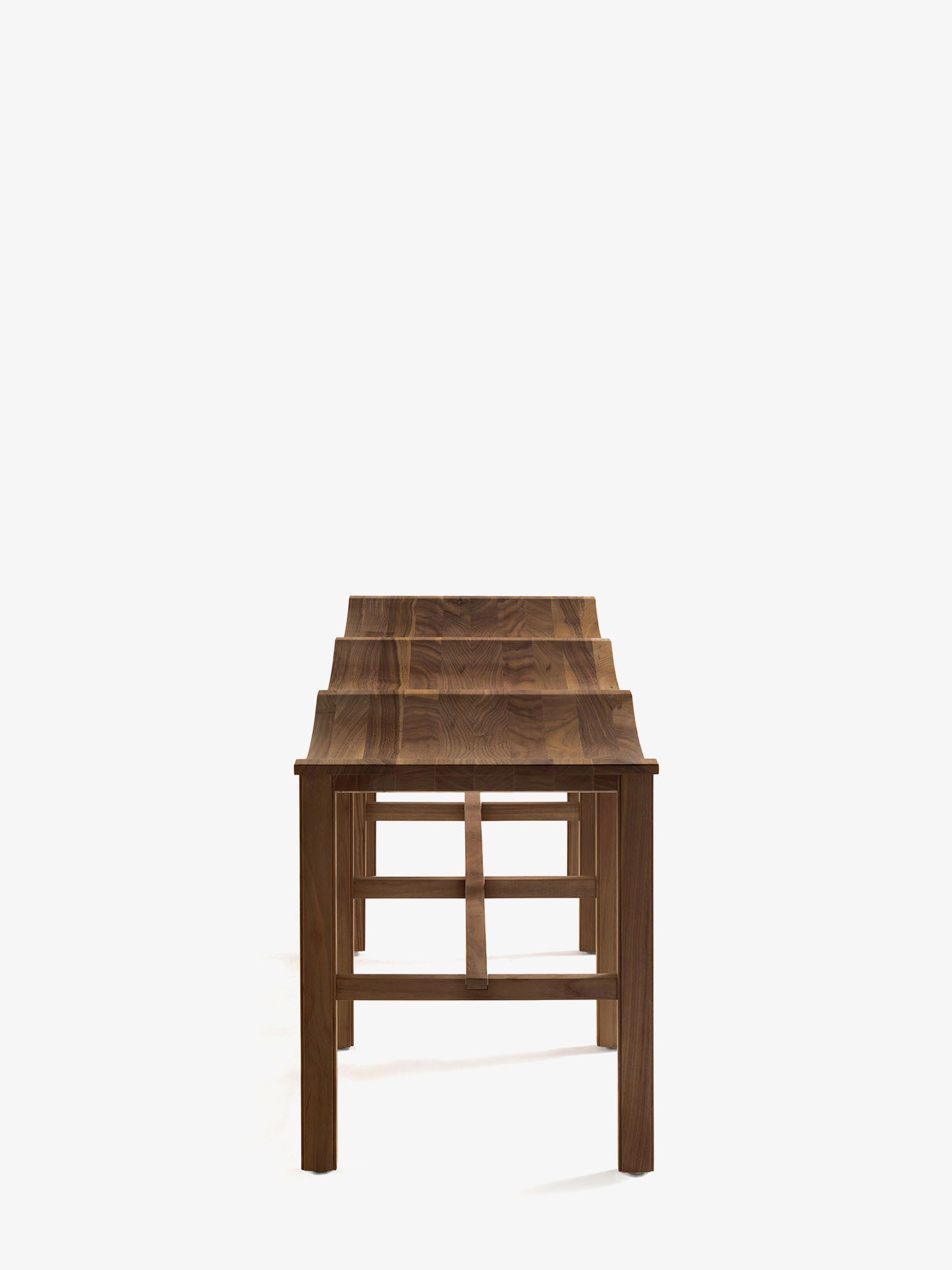 Panca interamente realizzata in legno massello a liste incollate, caratterizzata da un unico piano ergonomico in legno che continua per tutta la lunghezza della seduta e sostenuta da gambe squadrate.