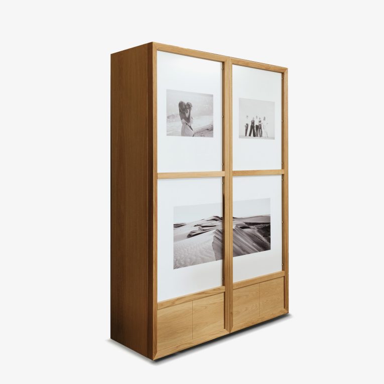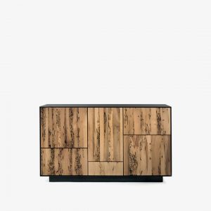 Credenza in legno massello e listellare, racchiusa da cornice in ferro o legno, caratterizzata da linee asimmetriche di ante e cassetti, assemblati con incastri a coda di rondine.
