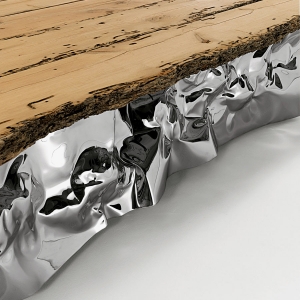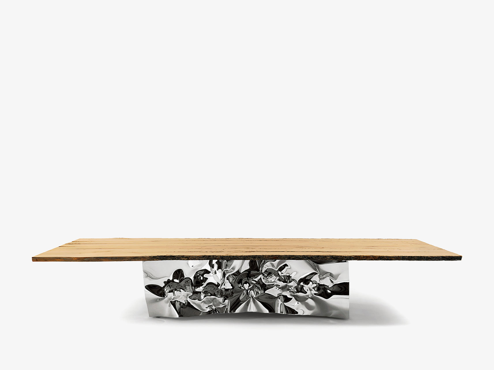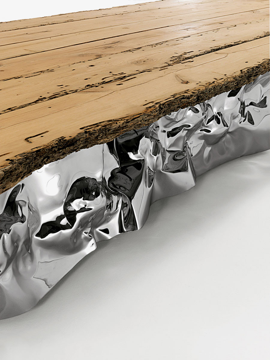 Tavolo con top realizzato in legno massello di Briccola, a liste accostate e bordi naturali, abbinato a base scultorea realizzata con fogli d’acciaio forgiati dall’artista di fama internazionale Helidon Xhixha.