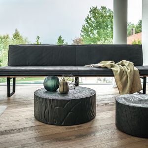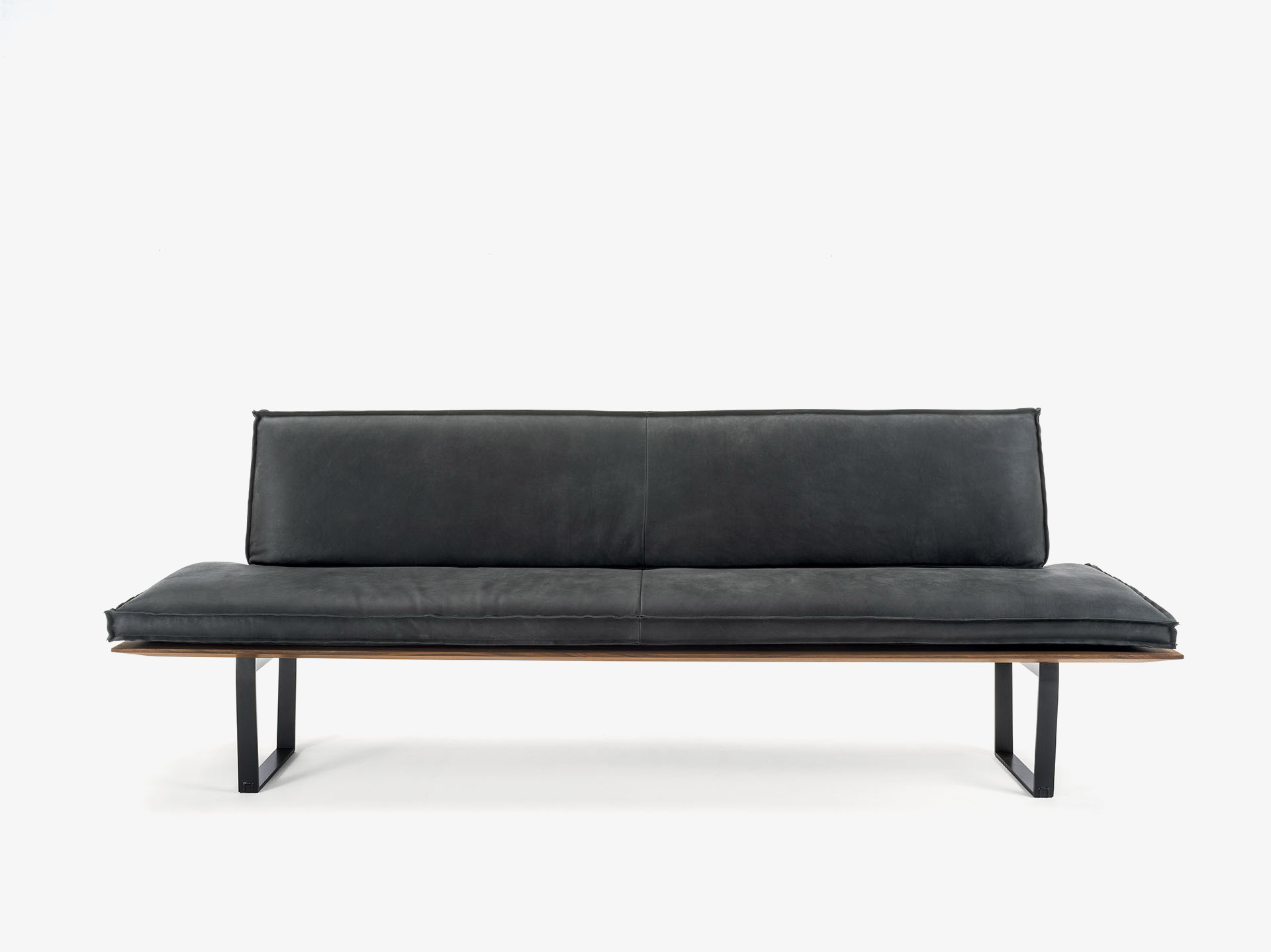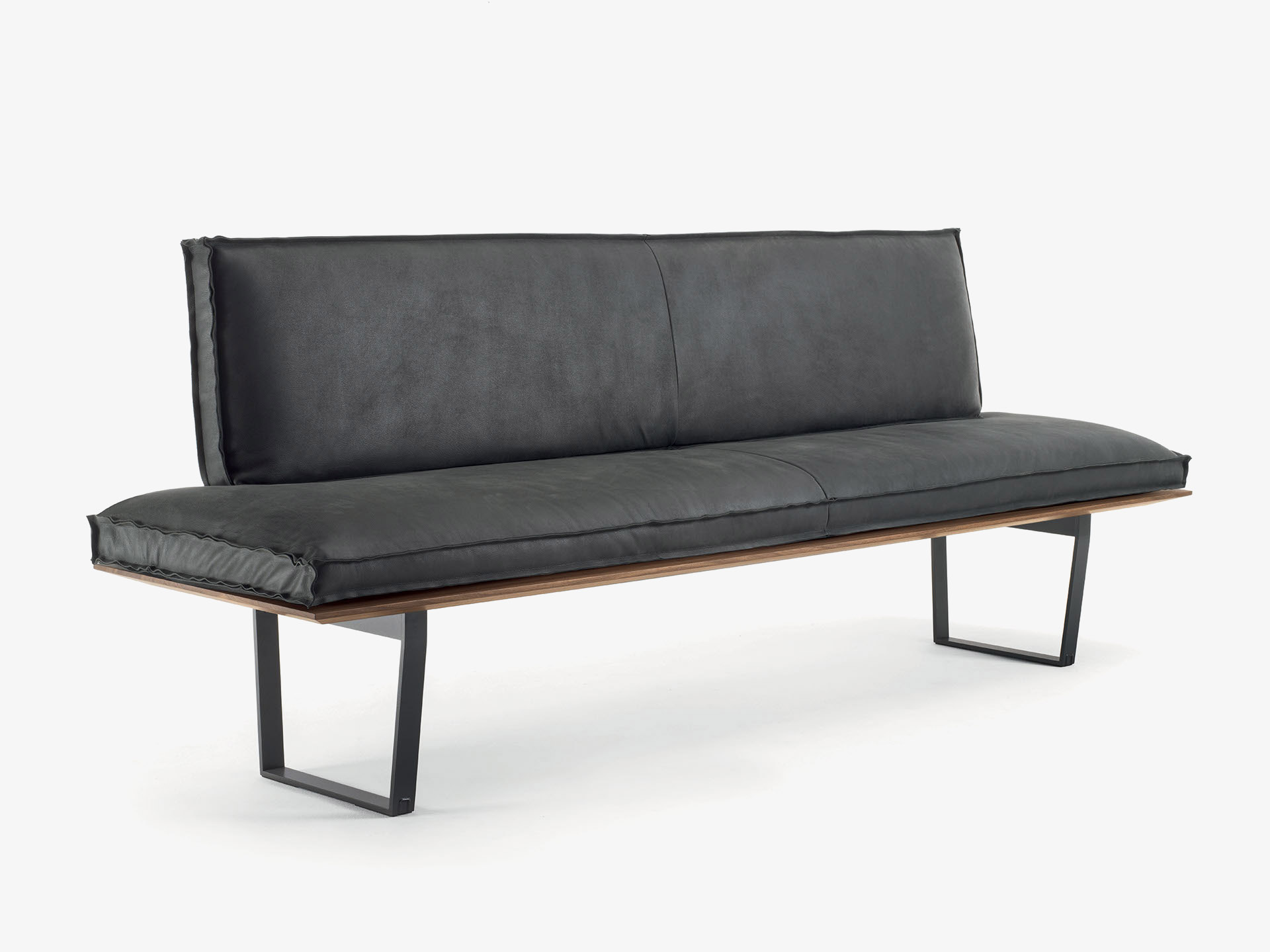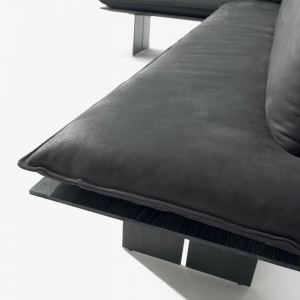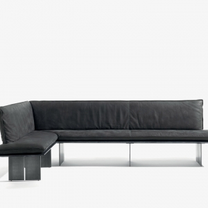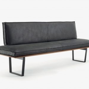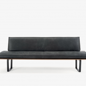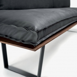 Panca con seduta realizzata in legno massello a liste incollate con lati pantografati, in abbinata a gambe in ferro. Seduta e schienale dotati di maxi cuscini rivestiti in pelle o tessuto con cuciture a vista, in due versioni diverse. Disponibile nella versione lineare o angolare.