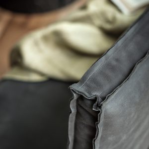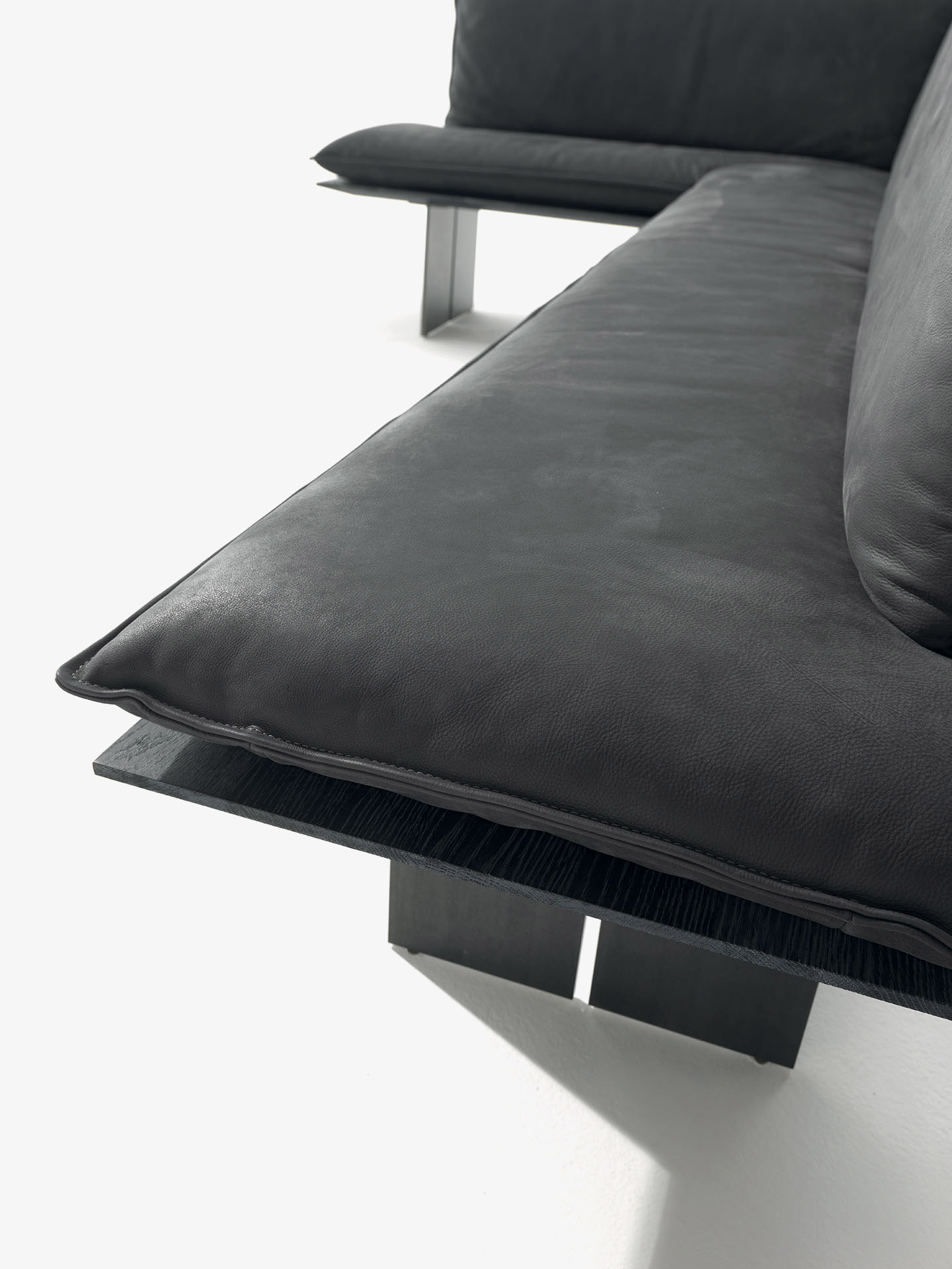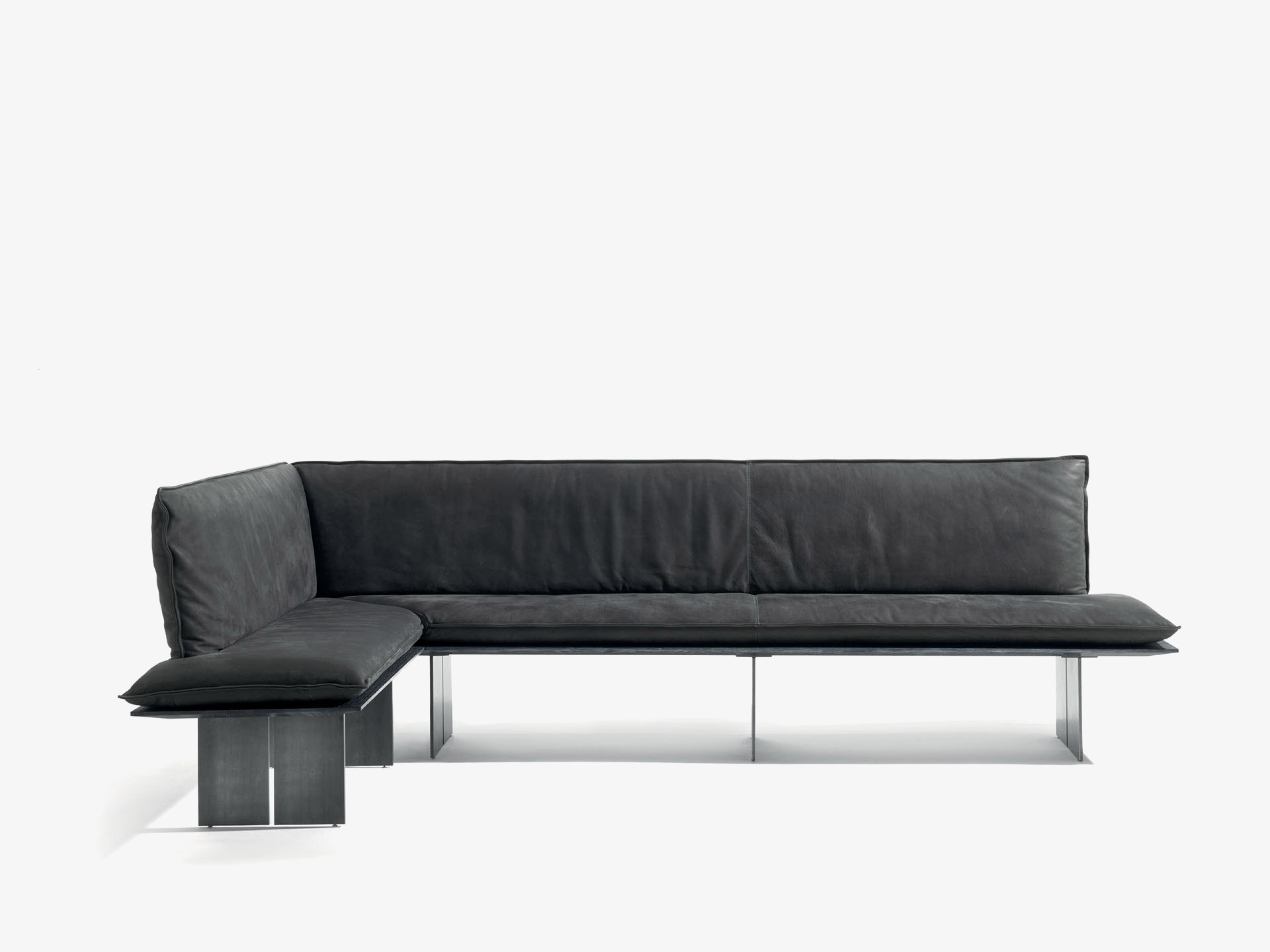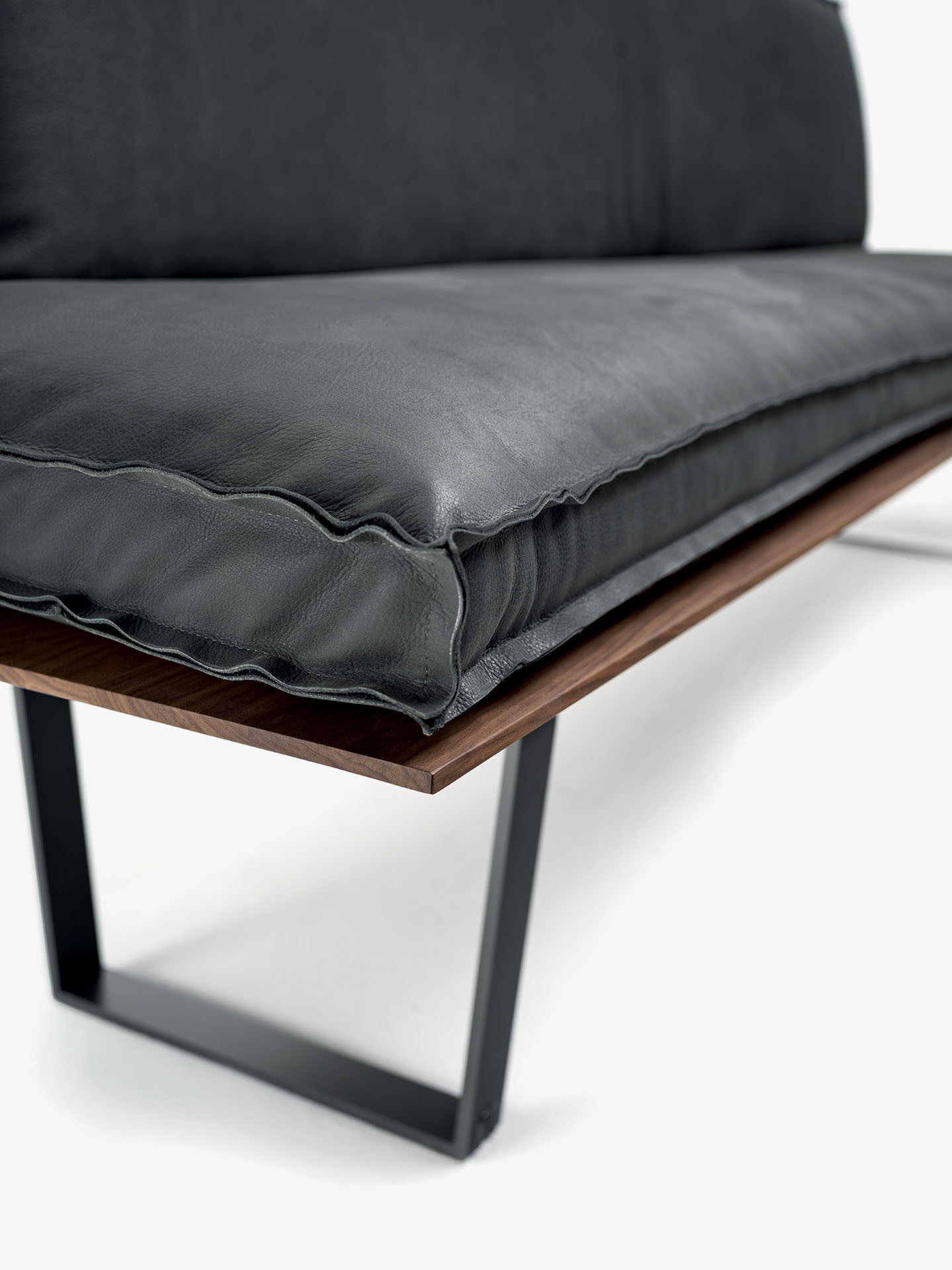 Panca con seduta realizzata in legno massello a liste incollate con lati pantografati, in abbinata a gambe in ferro. Seduta e schienale dotati di maxi cuscini rivestiti in pelle o tessuto con cuciture a vista, in due versioni diverse. Disponibile nella versione lineare o angolare.