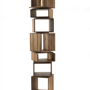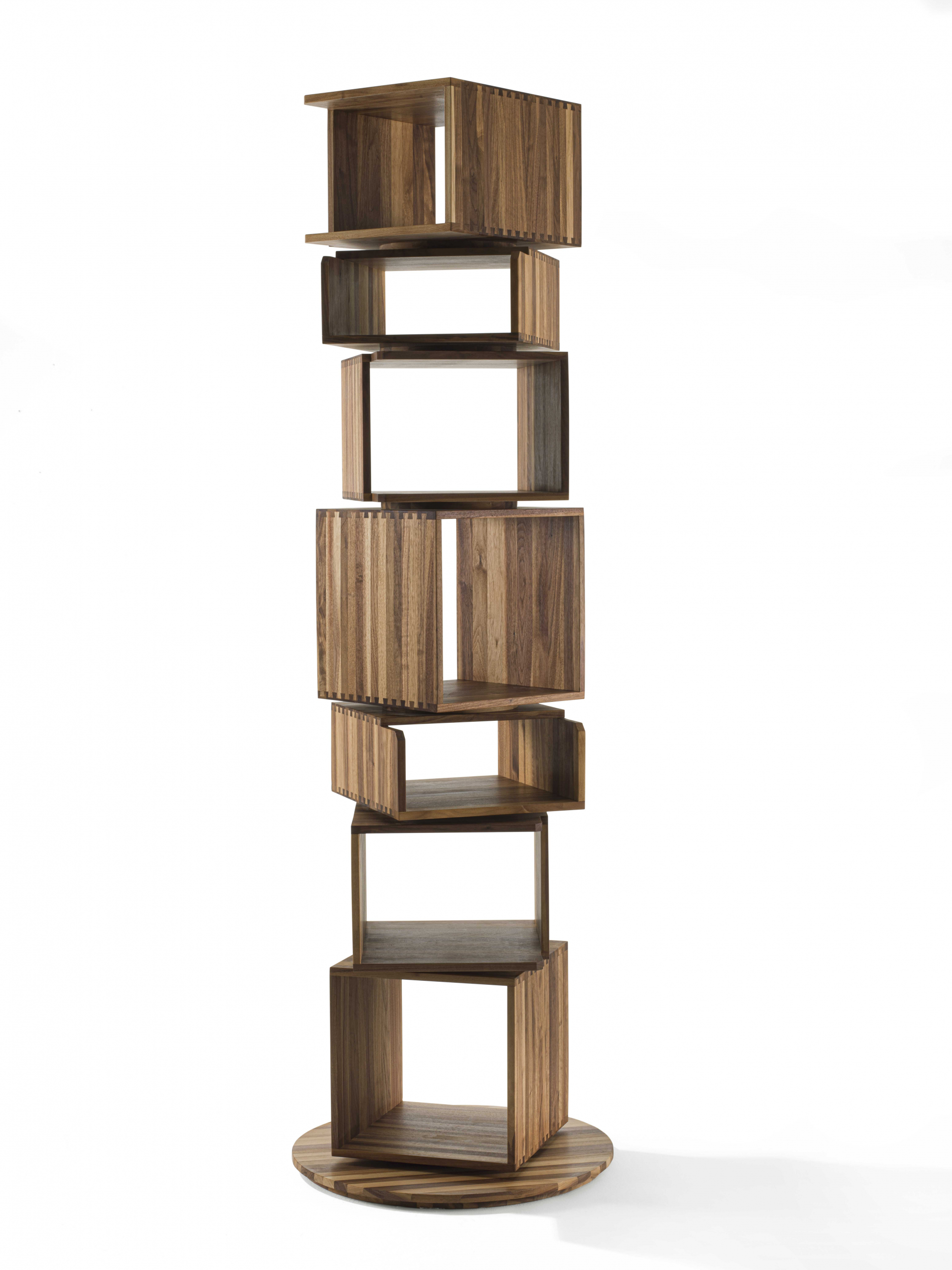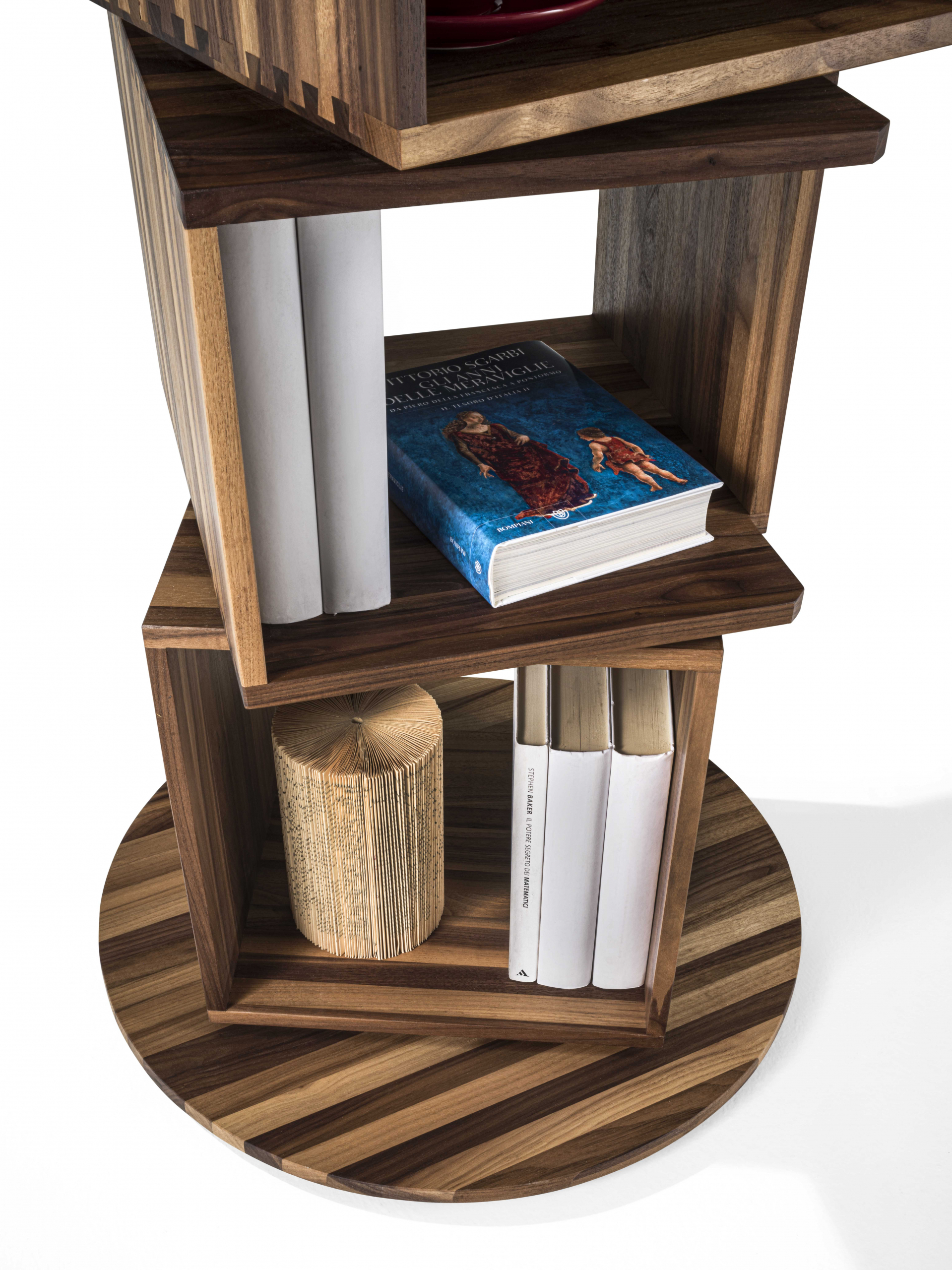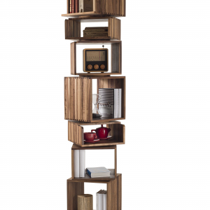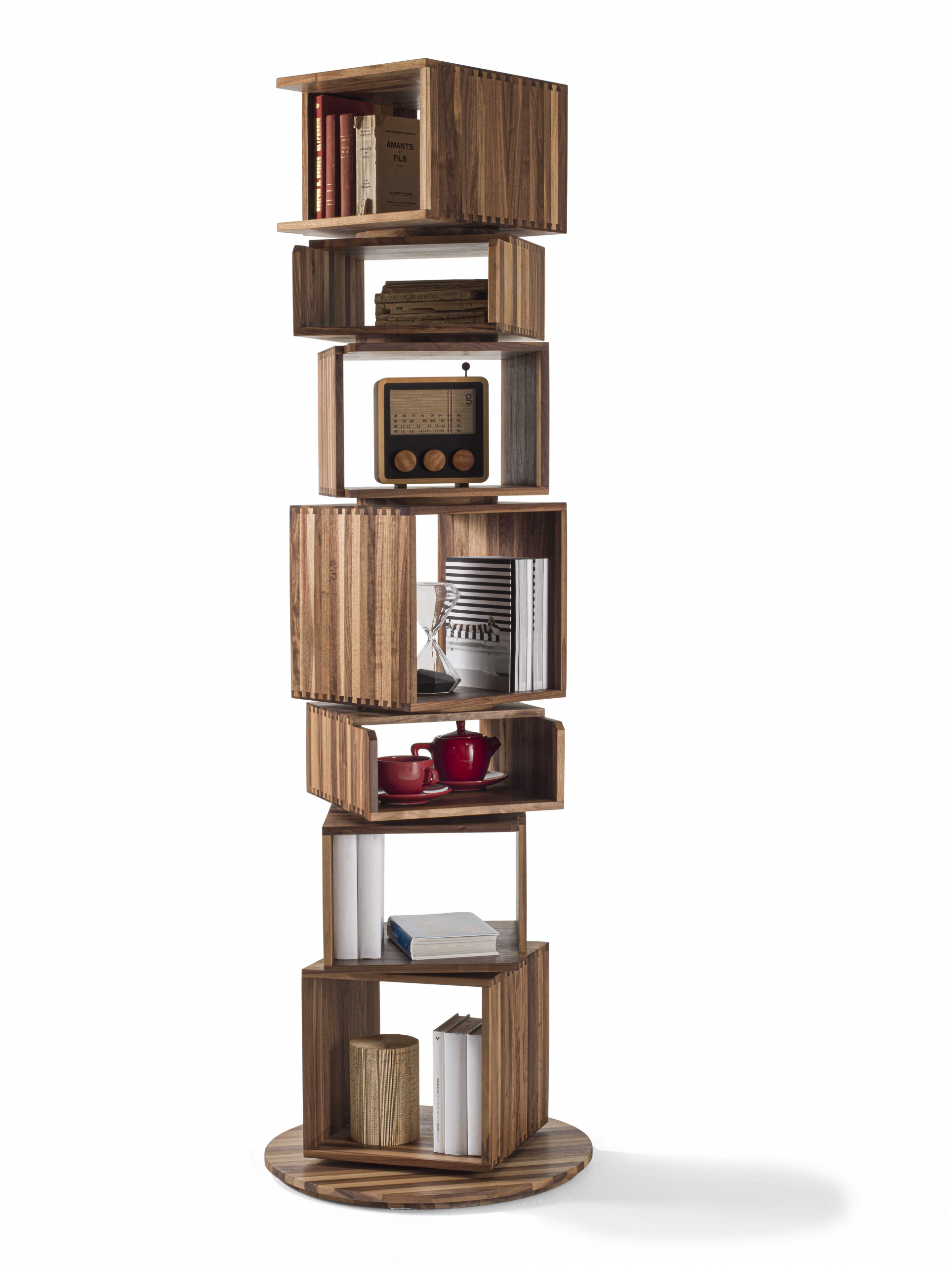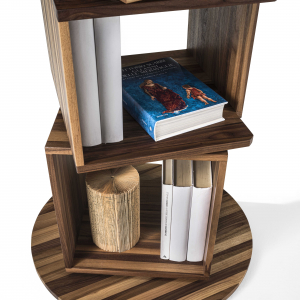 Libreria costituita da moduli impilati a colonna su base girevole.
