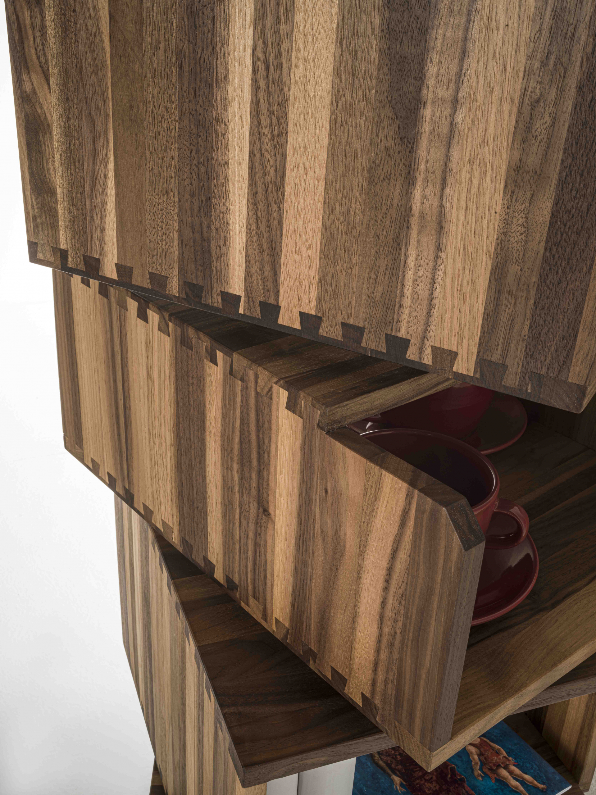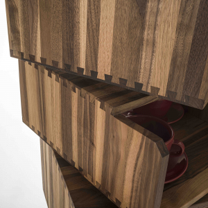 Legno massello spessore 1,5 cm e incastri a coda di rondine caratterizzano ogni elemento.