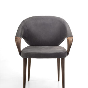 Poltroncina elegante ed avvolgente, con gambe e braccioli in legno massello. Seduta e schienale rivesti in pelle o tessuto.