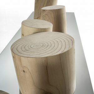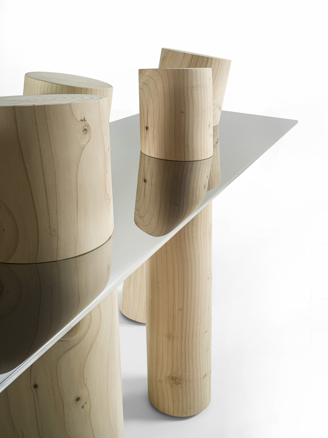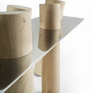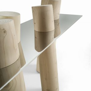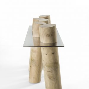Consolle caratterizzata da top in acciaio lucido (disponibile anche nella versione vetro extra chiaro e vetro “stopsol”) abbinato ad una serie di pali in legno massello di Cedro.