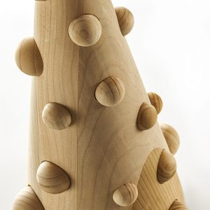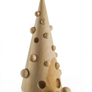 Il tradizionale albero di Natale viene interpretato da una forma conica, semplice e lineare, interrotta da molteplici fori tondi che accolgono piccole sfere in legno massello, che ricordano le palline decorative.