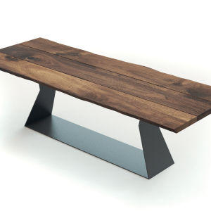 Стол со столешницей из массива дерева, состоящий из трех выровненных досок с естественными внешними краями, вариант оригинальной модели. Основание из железной плиты, характеризующееся геометрическими линиями