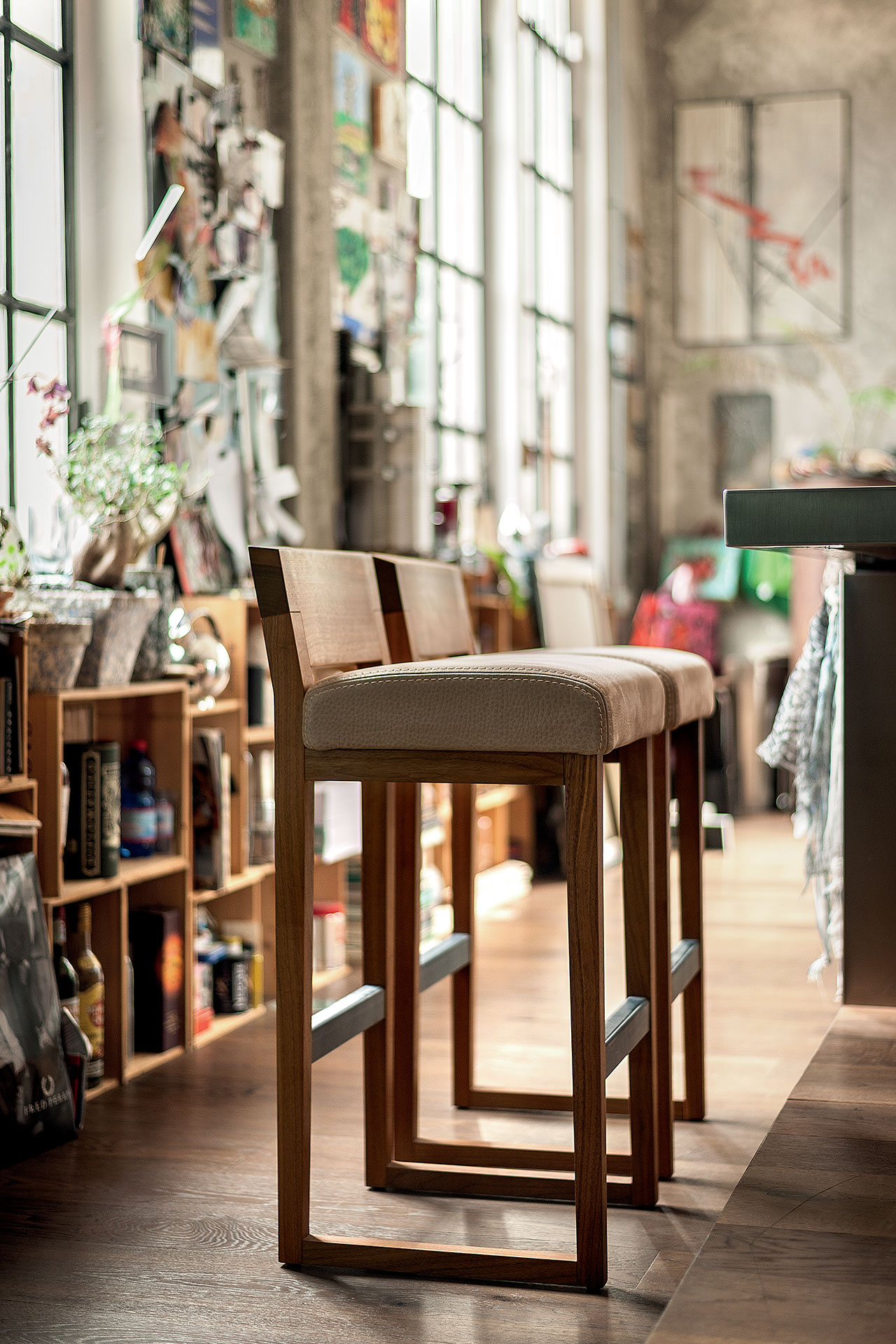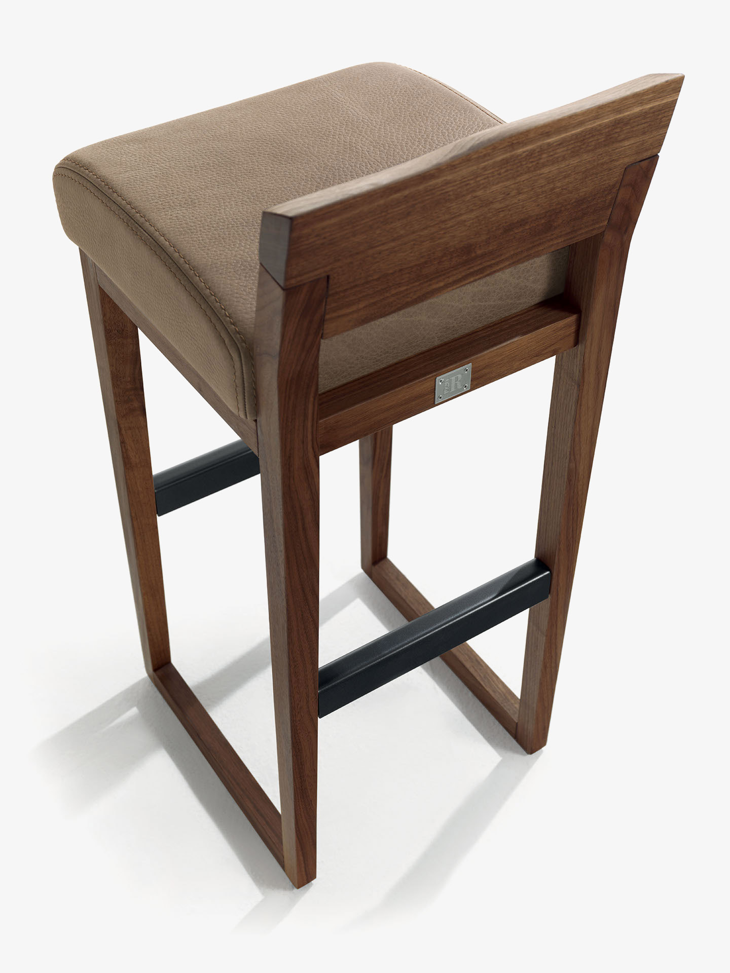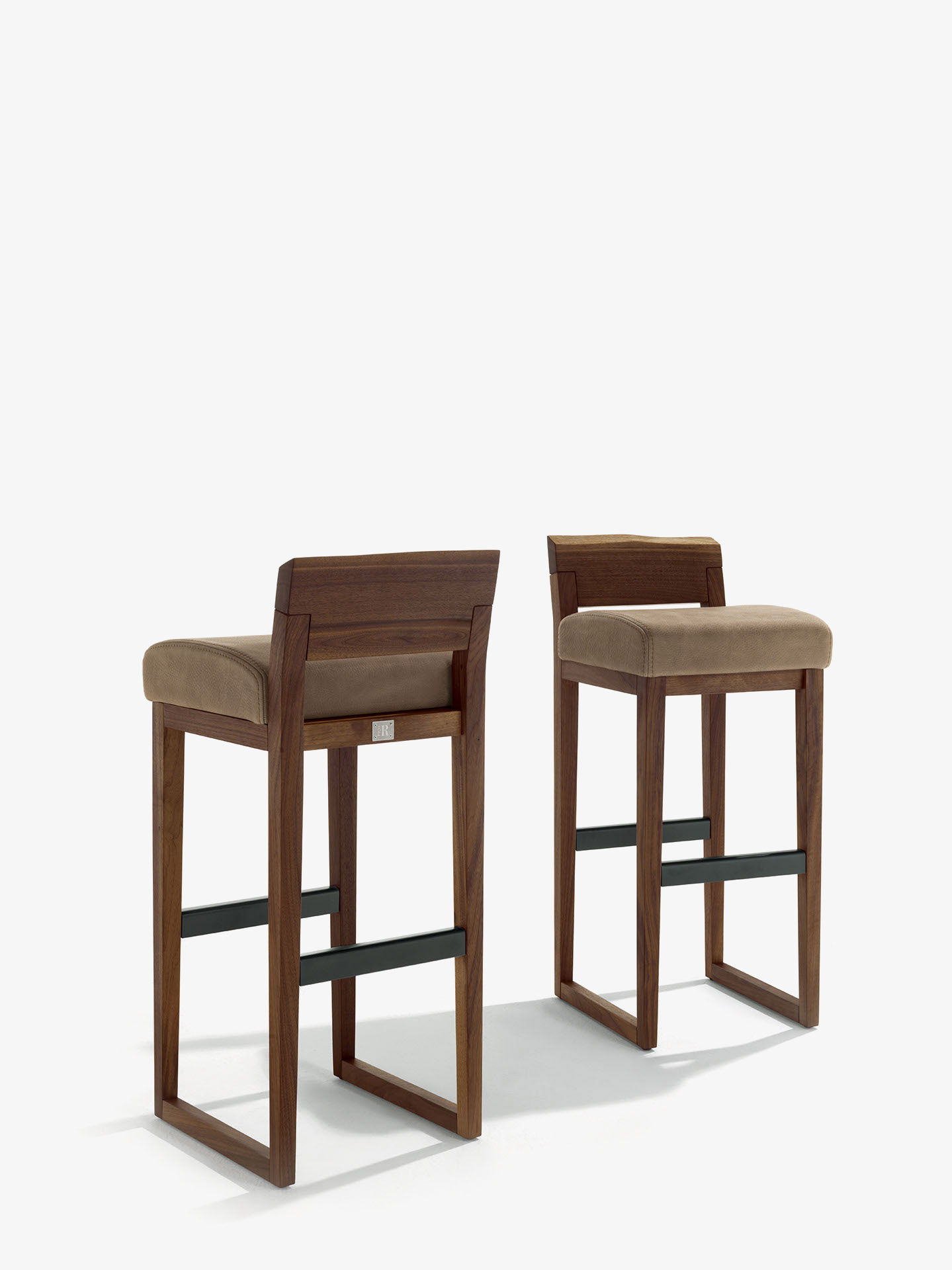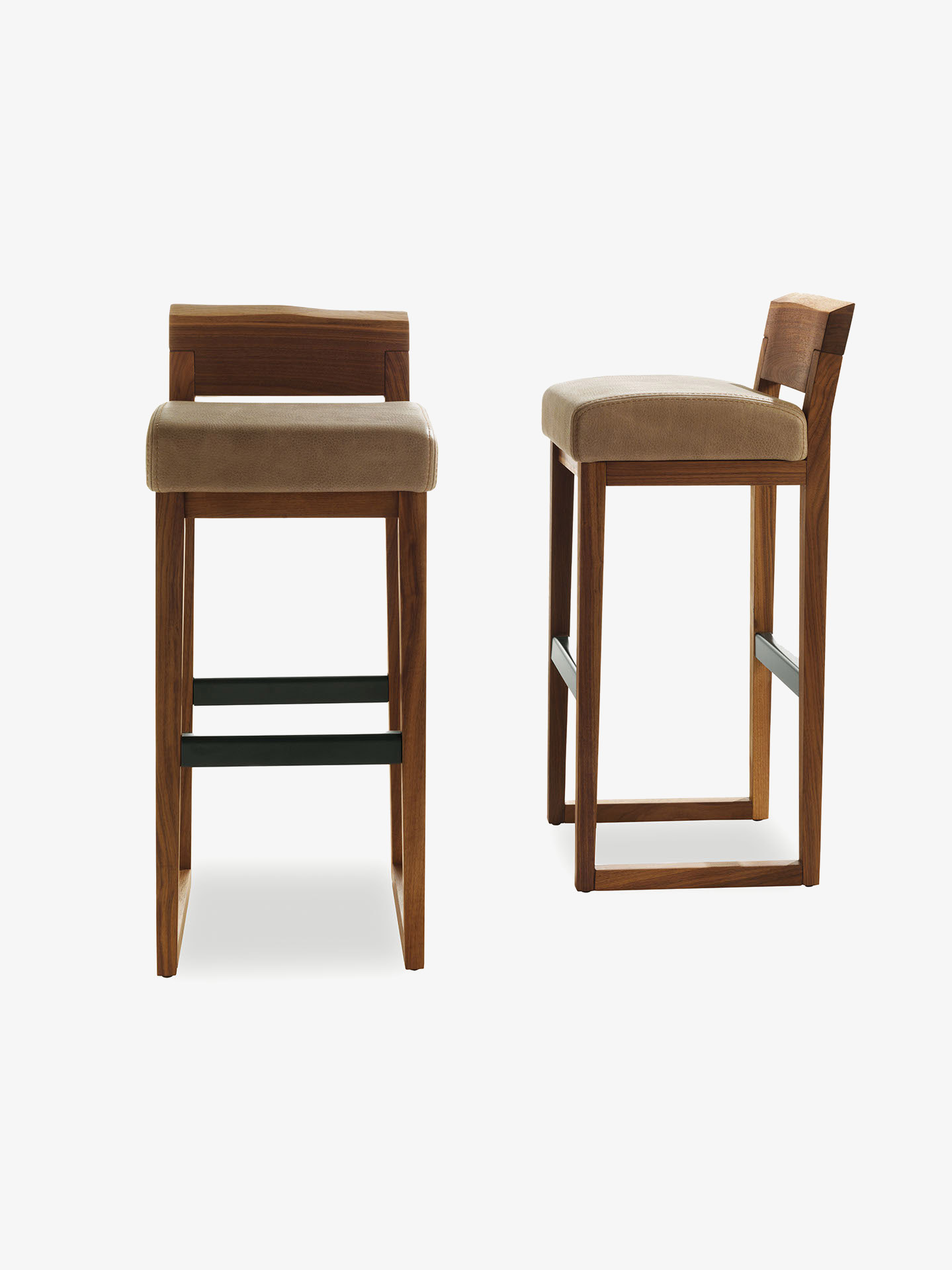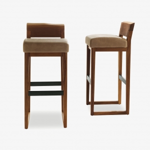 Барный стул с подставкой для ног из массива дерева со спинкой с естественным краем и сиденьем, обитым кожей или тканью. Доступен в двух вариантах высоты.