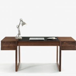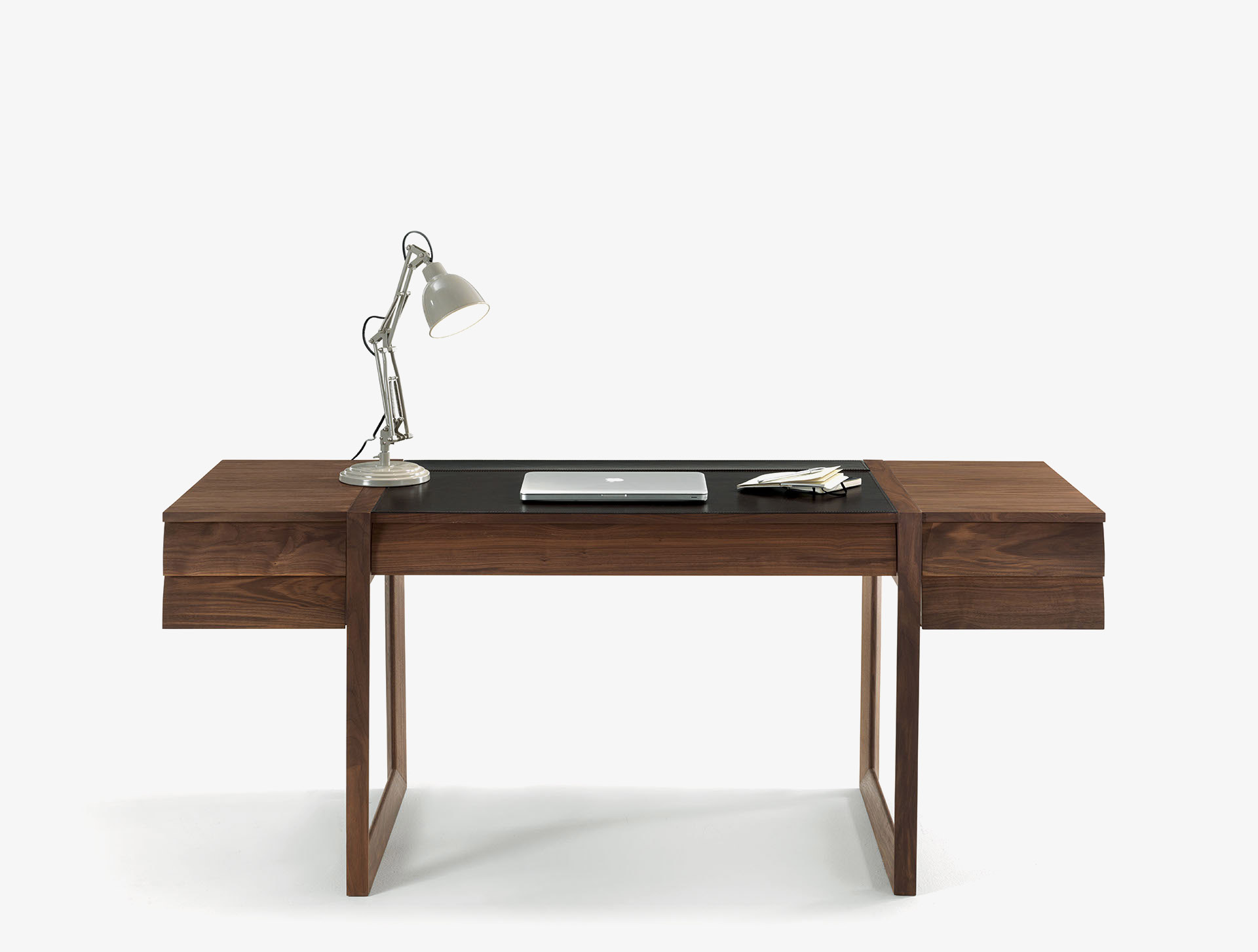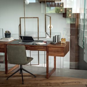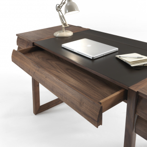 Письменный стол с квадратными линиями из шпонированного наборного массива с ящиками, собранными с соединениеми “ласточкин хвост”, и ножками из массива дерева.