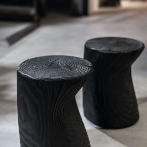 Табурет из массива душистого кедра, изготовленный из цельного блока, с боковым углублением.