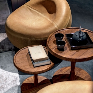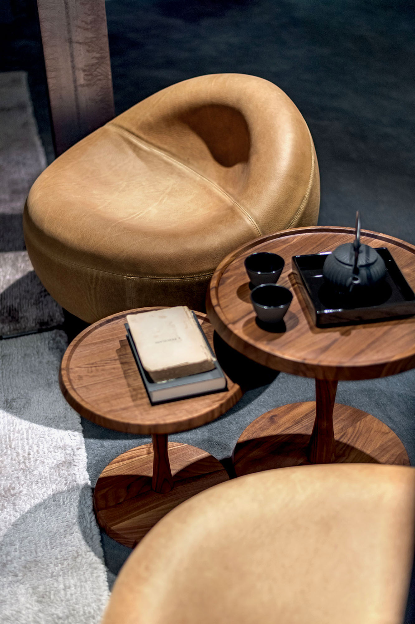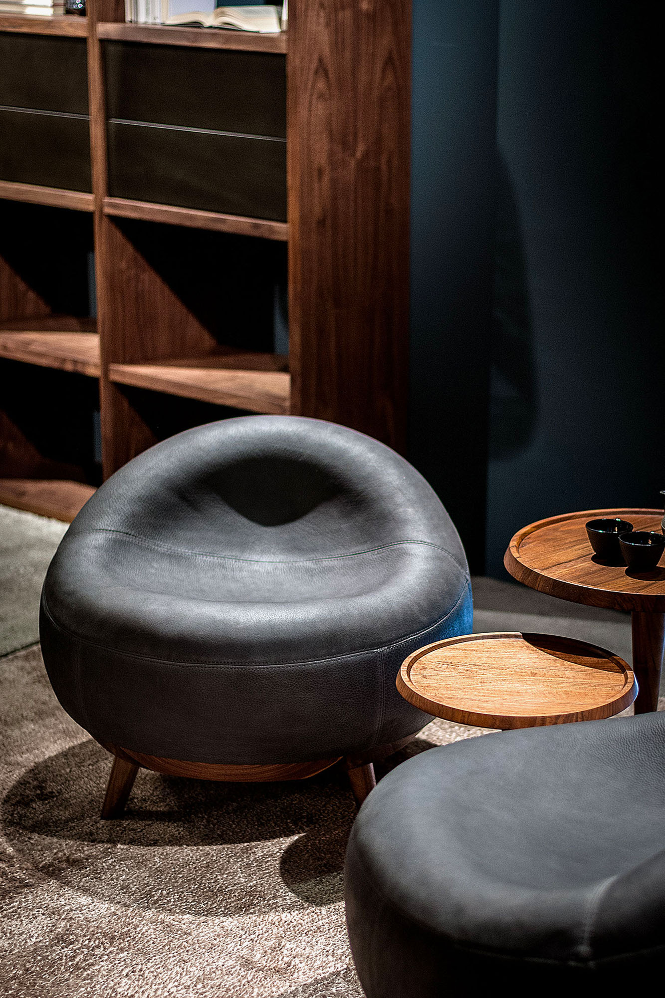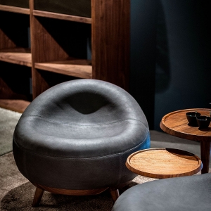 Кресло с мягкой структурой из многослойного дерева и кожаной обивкой с видимыми прострочками, повторяющими обычный геометрический рисунок. Основание и ножки из массива дерева.