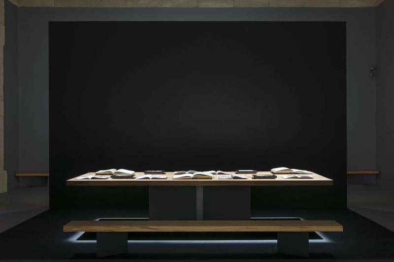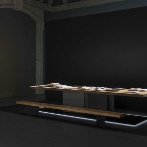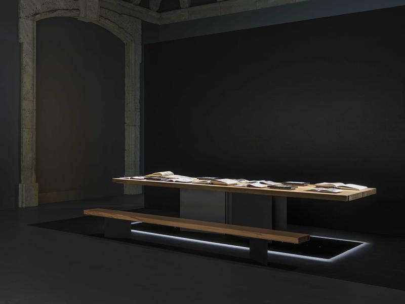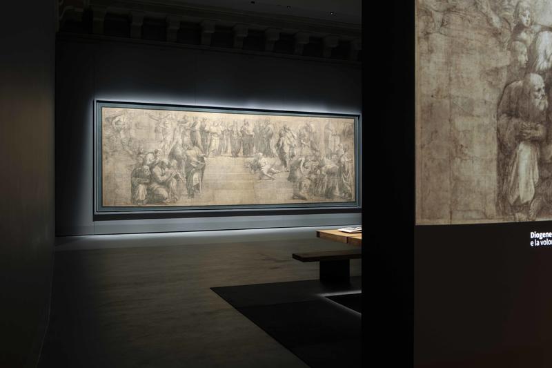 “Tutte le nostre scelte di allestimento, a partire dalle sequenze di avvicinamento al grande Cartone, sono pensate per preparare il pubblico alla visione di un’opera che trattiene – intatta – in sé una mirabile congiunzione di significati, essendo al tempo un’opera finita e tuttavia destinata a preparare un’opera conclusiva” afferma Stefano Boeri. “Per questo abbiamo progettato per la stessa sala un grande tavolo di rovere massello (realizzato da Riva1920) in grado di raccogliere testi e documenti di approfondimento sulla storia del Cartone, sulla sua fattura, sulla sua relazione con l’affresco ospitato nella Sala della Segnatura ai Musei Vaticani”.